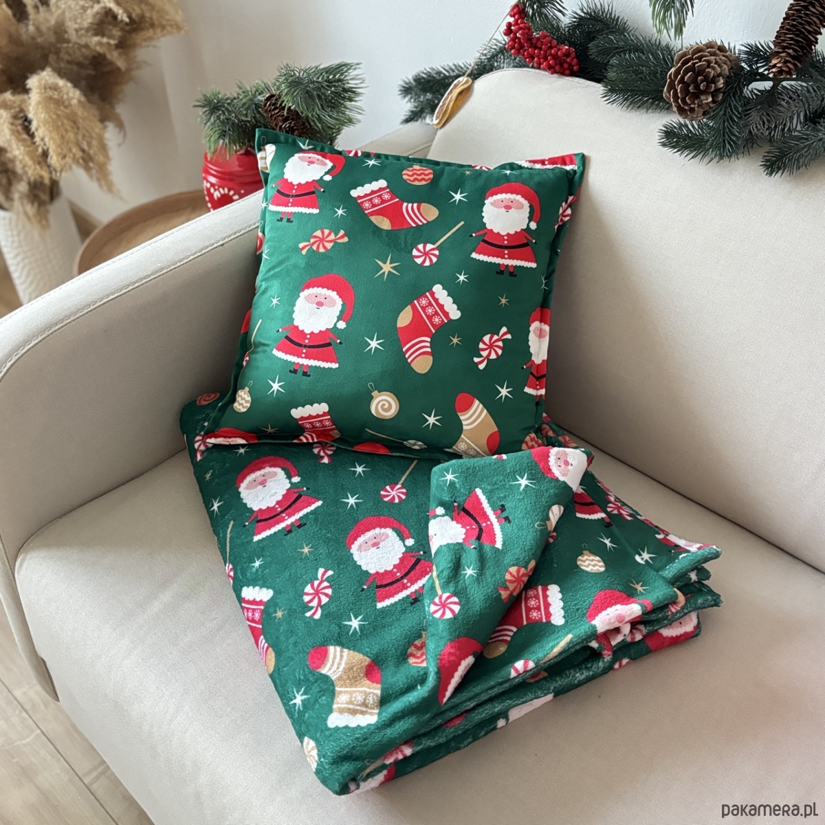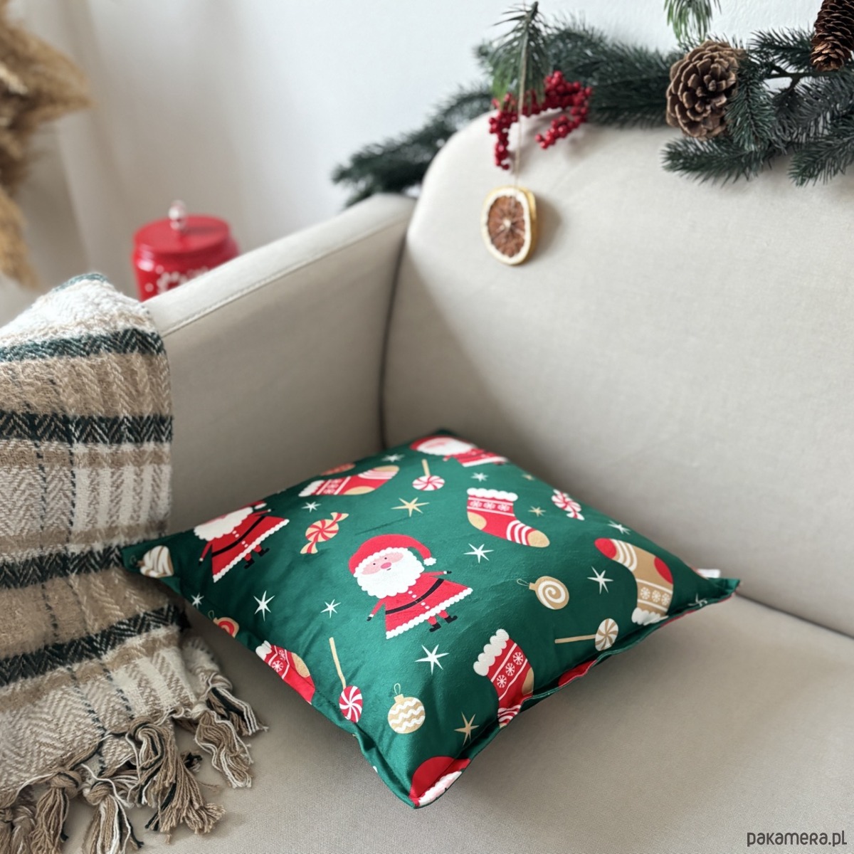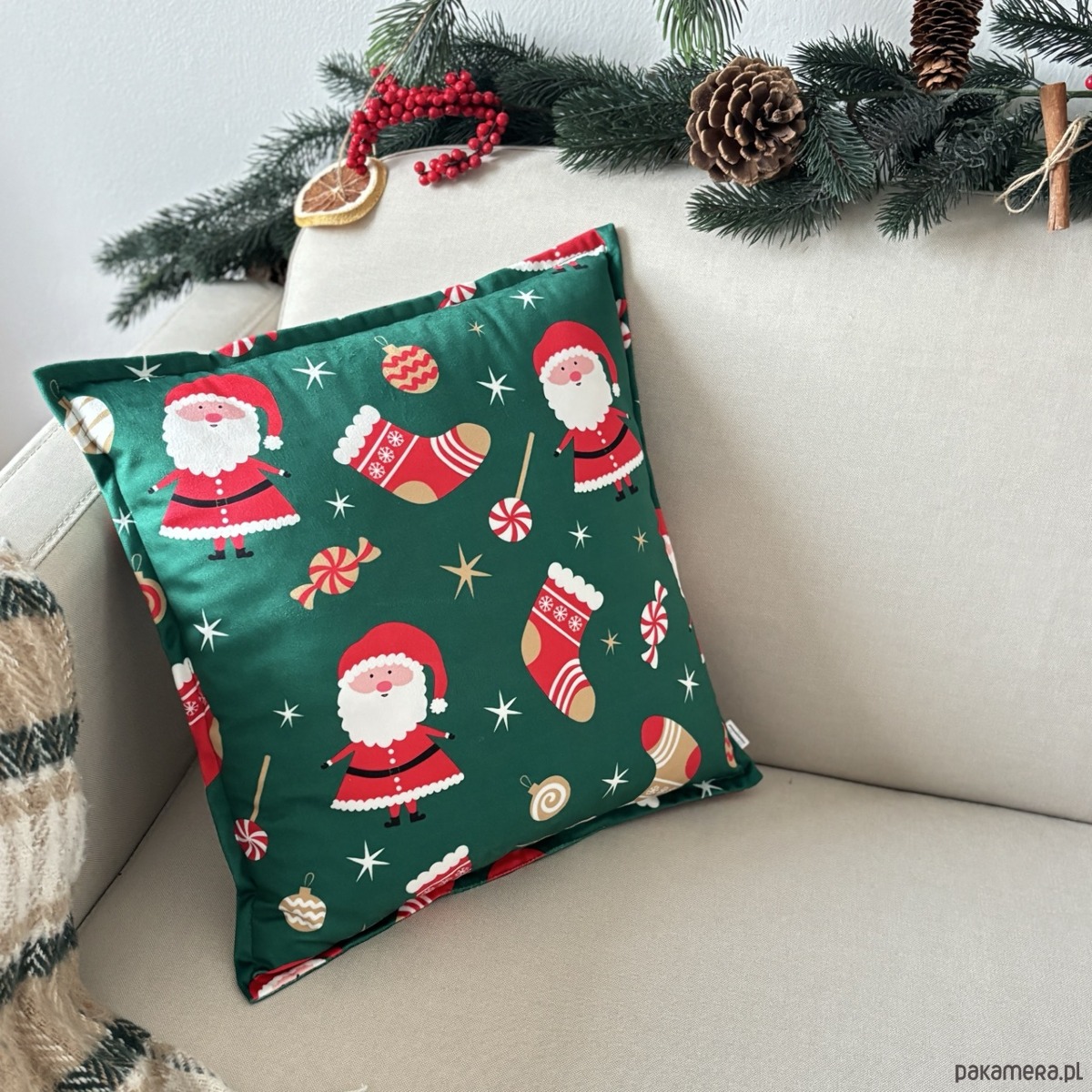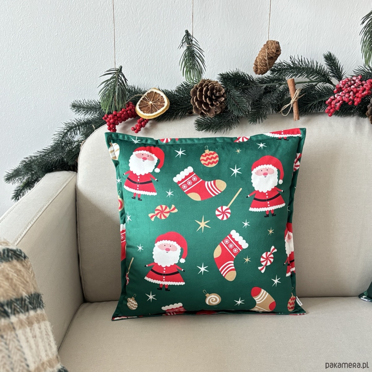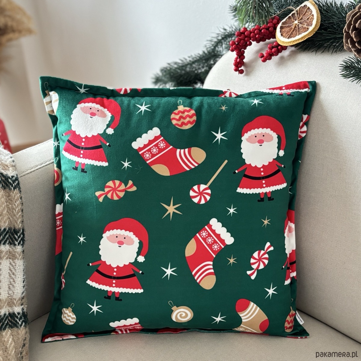 Kolory: Wielokolorowa poduszka z nadrukiem w intensywne, czerwone Mikołaje i zabawne Skarpety w świątecznym klimacie na zielonym tle.