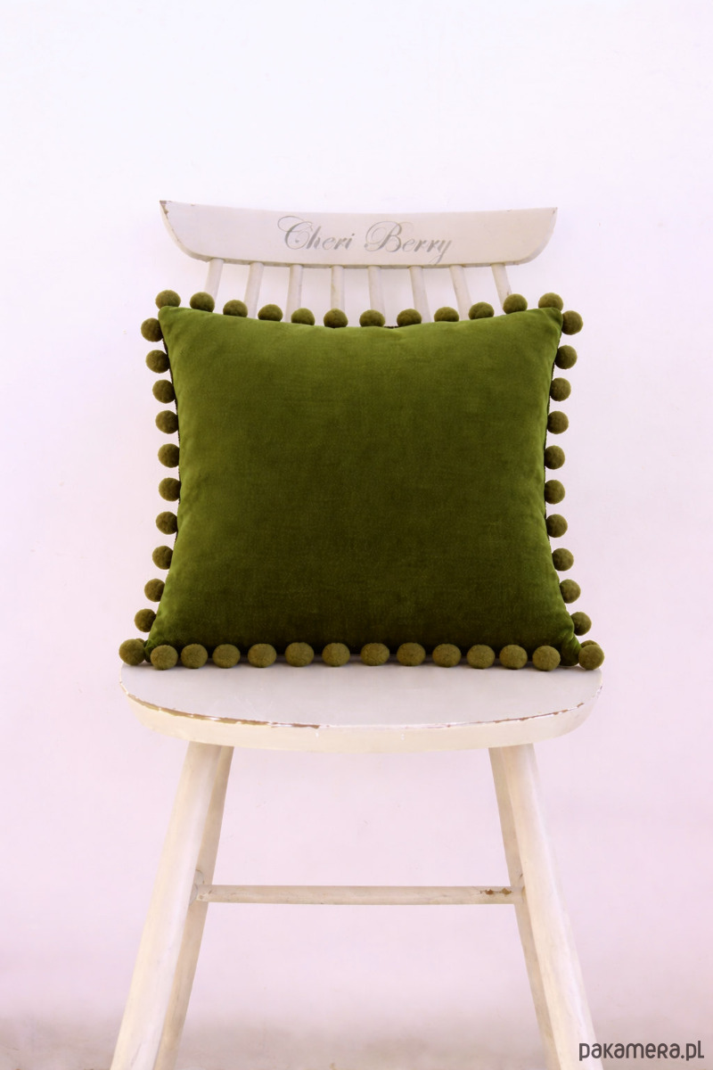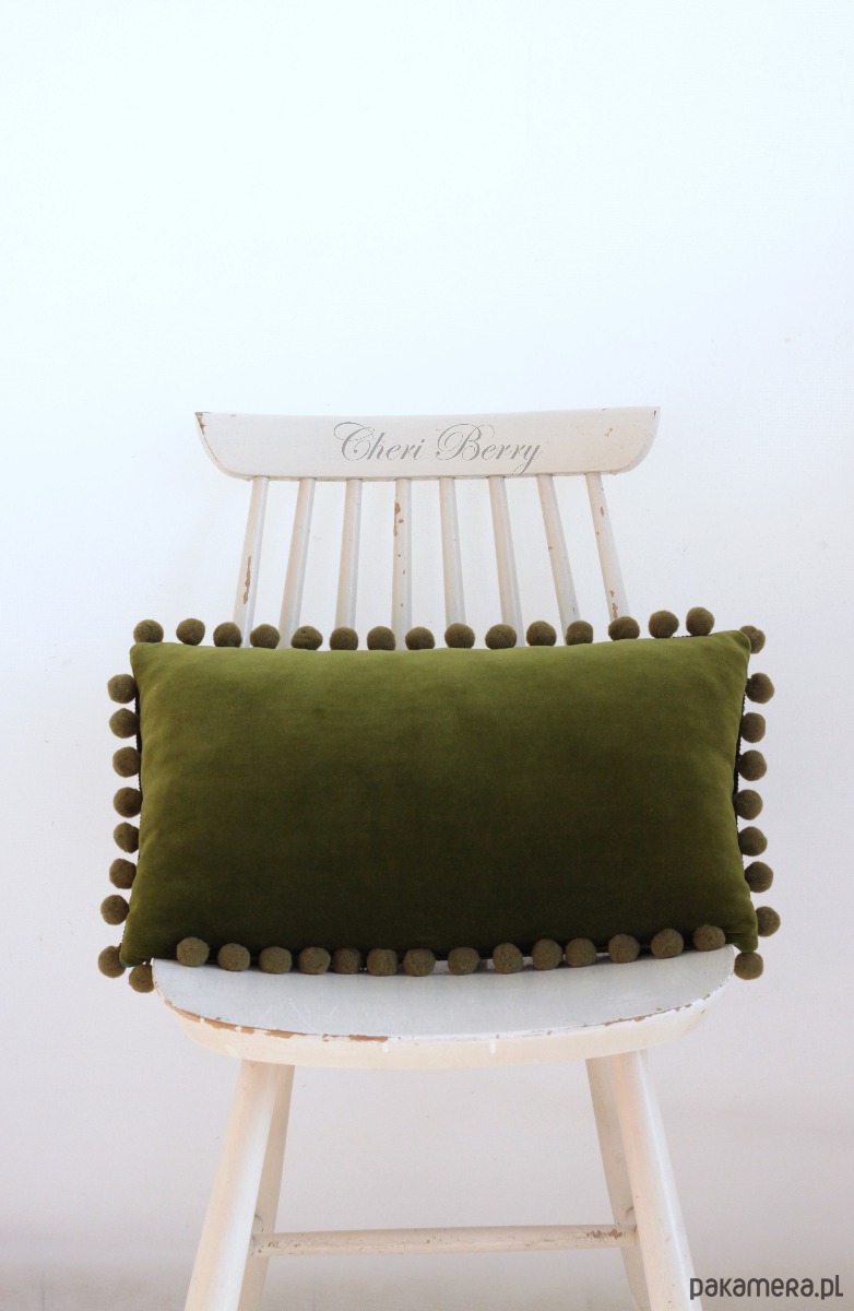 Poduszka dekoracyjna vintage oliwkowa z pomponami