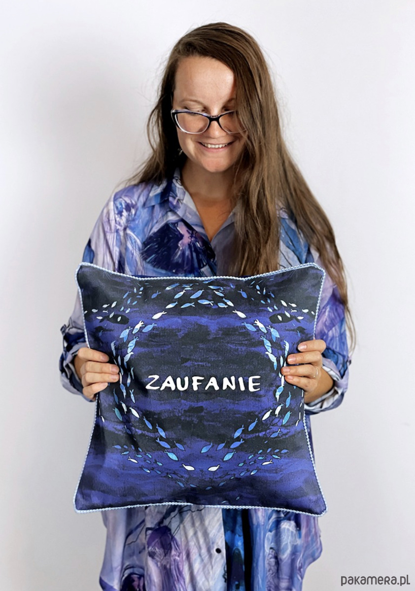 Dekoracyjne poduszki uszyte lokalnie z bawełny polskiej produkcji - każda poduszka ma specjalnie zaprojektowaną autorską grafikę dopasowaną do kwadratowego wymiaru standardowej poszewki na jaśka 40x40cm. Centralna kompozycja printu obramowana kontrastową lamówką - tył poduszki jest gładki z jednokolorowej bawełny w odcieniu pasującym do wzoru z przodu.