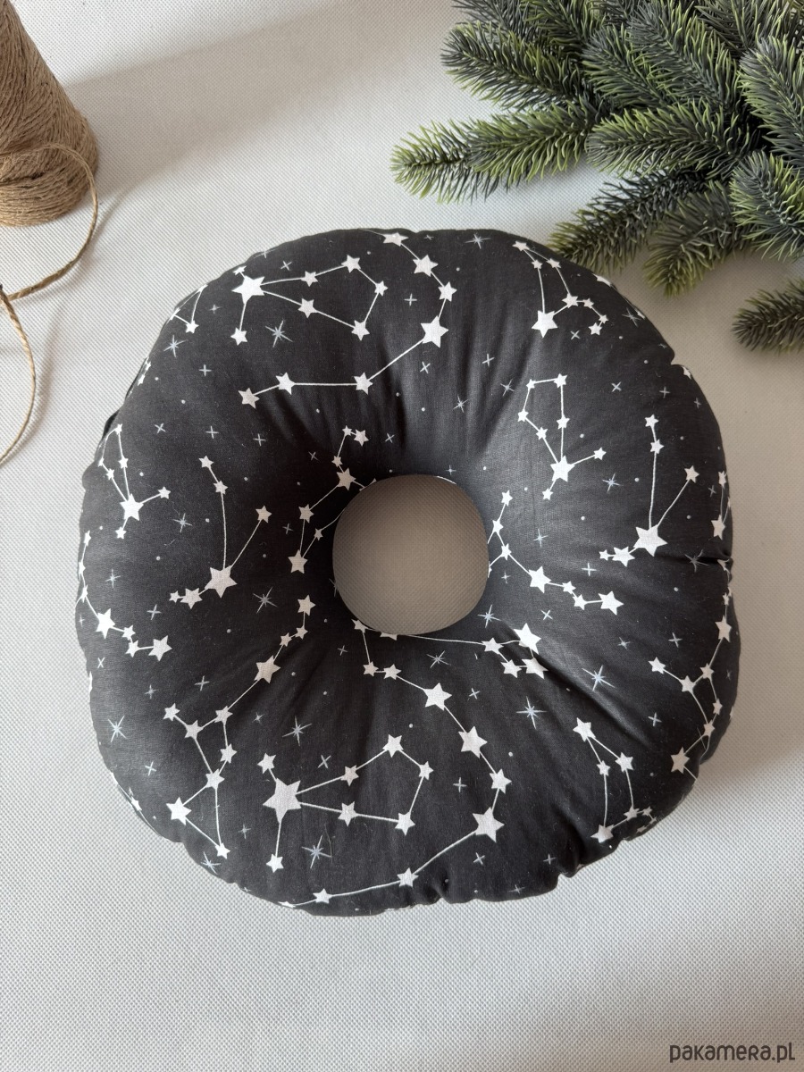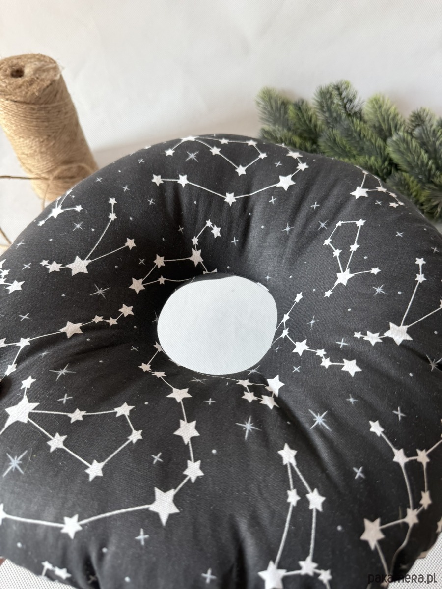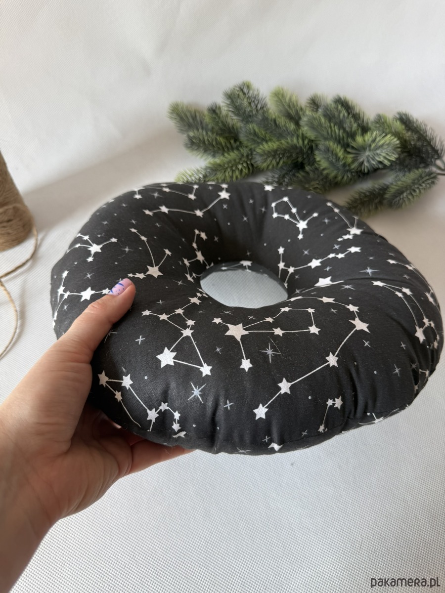 Poduszka ma kompaktowy, okrągły kształt o wymiarach ok. 32 × 32 cm – idealna zarówno do łóżka, jak i w podróży. Świetnie sprawdzi się nie tylko po przekłuciach uszu, ale także przy stanach zapalnych, rekonwalescencji po operacjach czy dla osób korzystających z aparatów słuchowych.