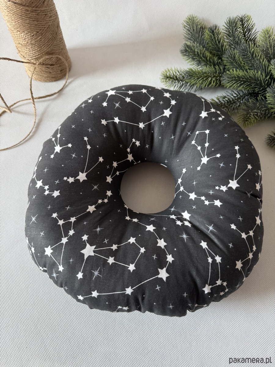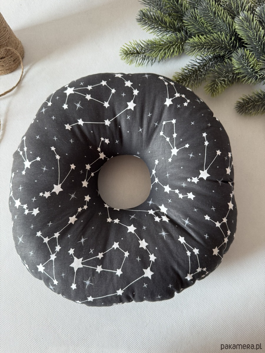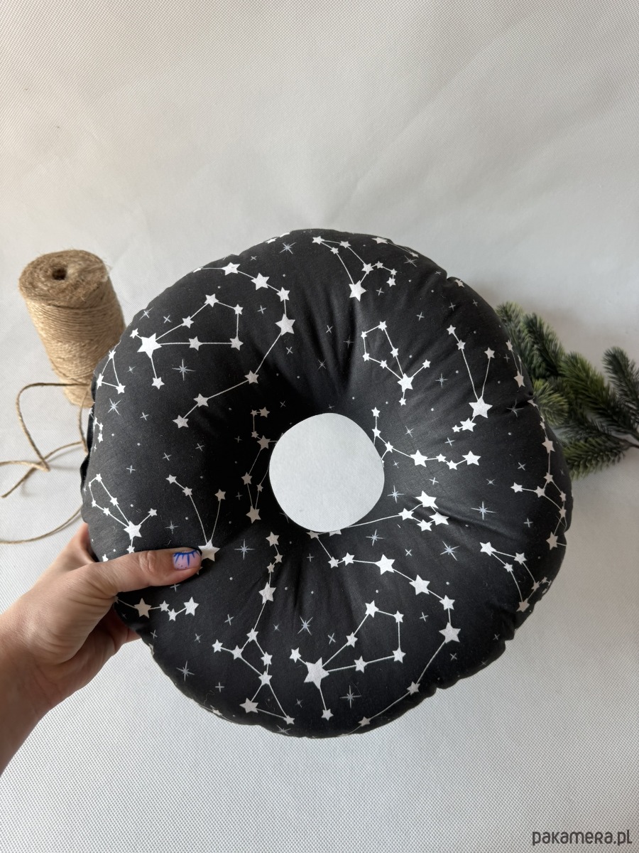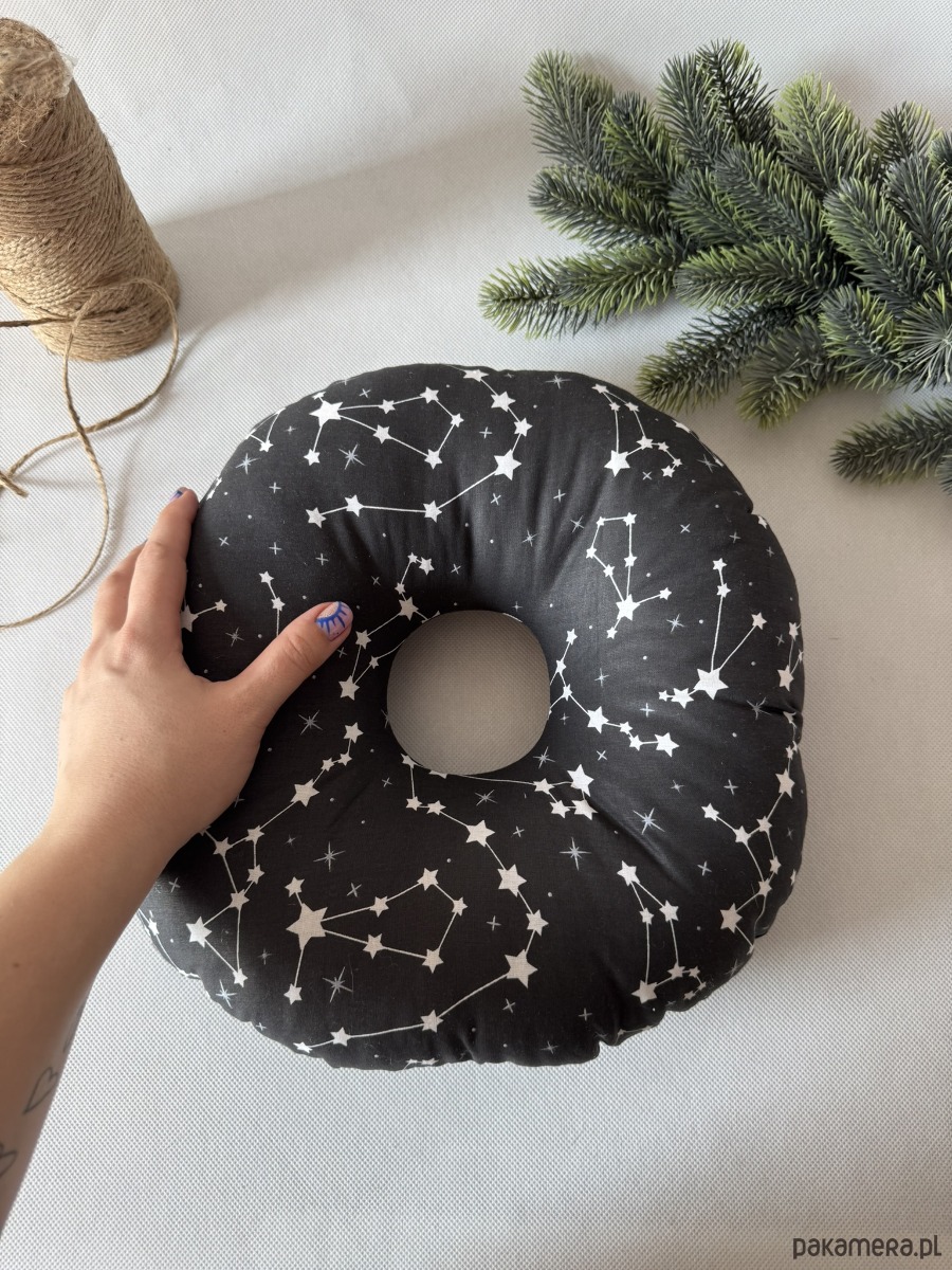 Poduszka ma kompaktowy, okrągły kształt o wymiarach ok. 32 × 32 cm – idealna zarówno do łóżka, jak i w podróży. Świetnie sprawdzi się nie tylko po przekłuciach uszu, ale także przy stanach zapalnych, rekonwalescencji po operacjach czy dla osób korzystających z aparatów słuchowych.