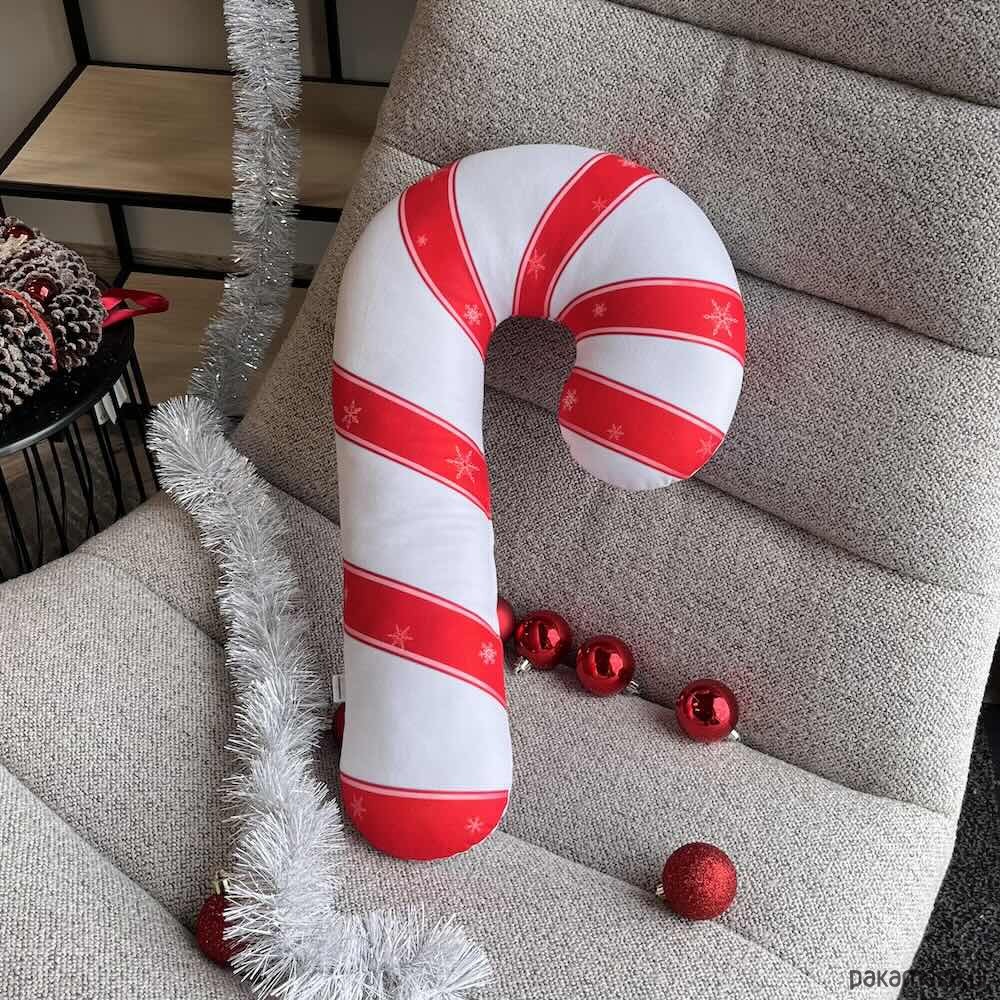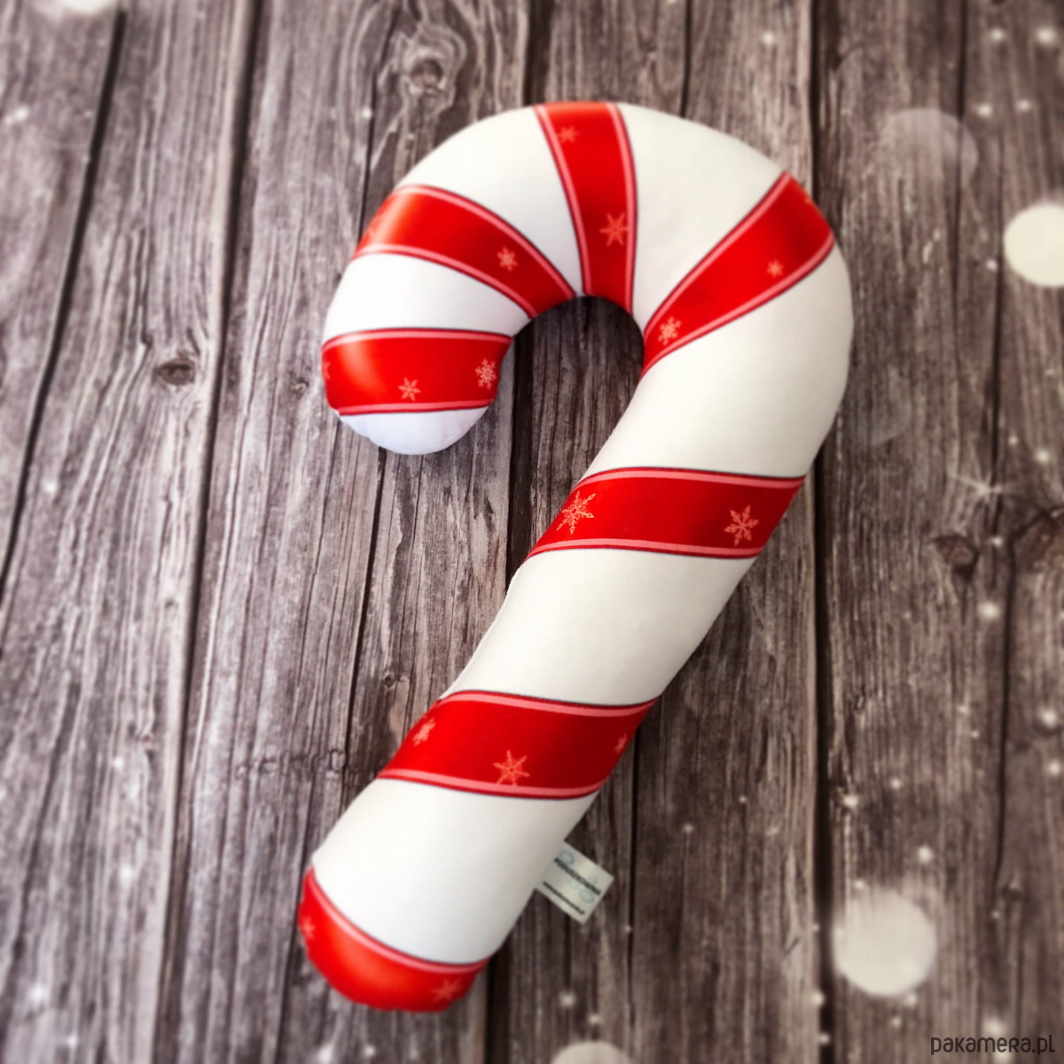 Poduszka w kształcie wielkiego cukierka Laski świątecznej Candy Cane z nadrukowaną czerwoną wstążką. Zabawna bardzo realistyczna, przypomina prawdziwy cukierek na Boże Narodzenie. Poduszka cukierek choinkowy, bardzo fajny pomysł na prezent, sprawdzi się w każdej aranżacji świątecznej, jak również w podróży, służąc za poduszkę podróżną na szyję. Poduszka ma 55 cm długości.