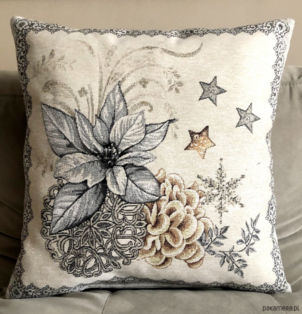 Śliczna poduszka z gwiazdą betlejemską. Z przodu gobelinowy wzór, z tyłu pikowany velvet. Wysokość - szerokość ok. 40 cm.