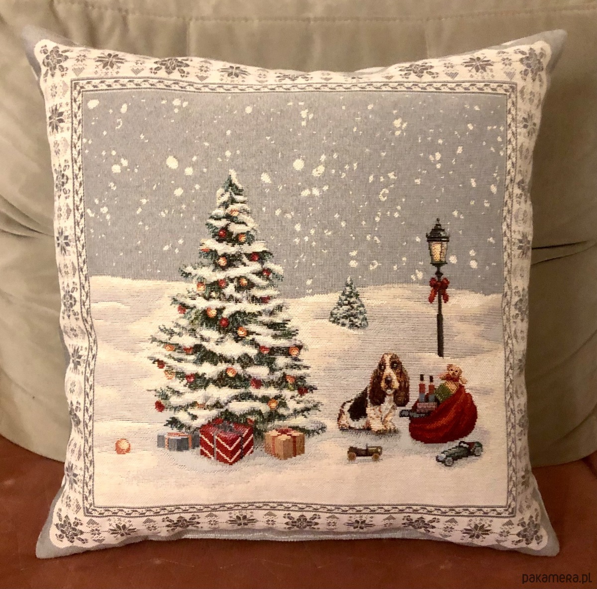 Śliczna poduszka z pieskiem i choinką. Z przodu gobelinowy wzór, z tyłu pikowany velvet. Wysokość - szerokość ok. 40 cm.