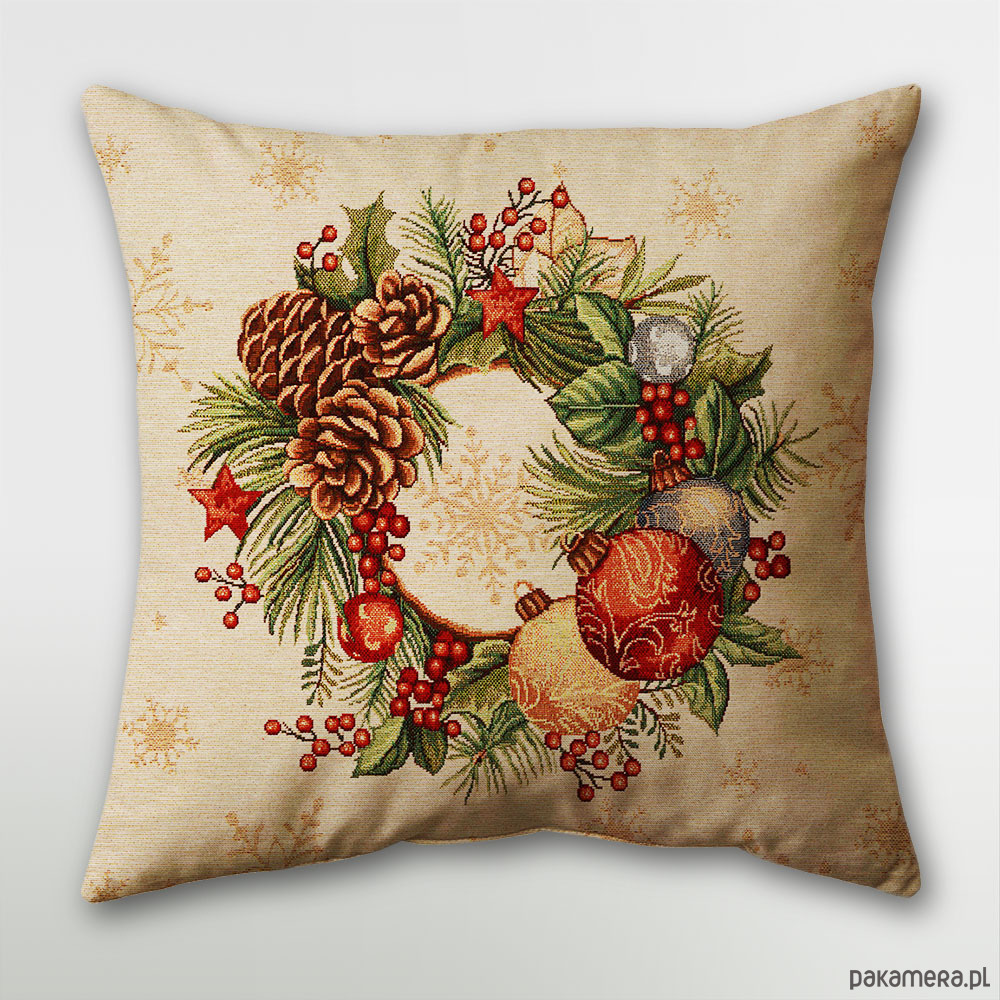 Śliczna poduszka ze świątecznym wiankiem. Z przodu gobelinowy wzór, z tyłu pikowany velvet. Wysokość - szerokość ok. 40 cm.