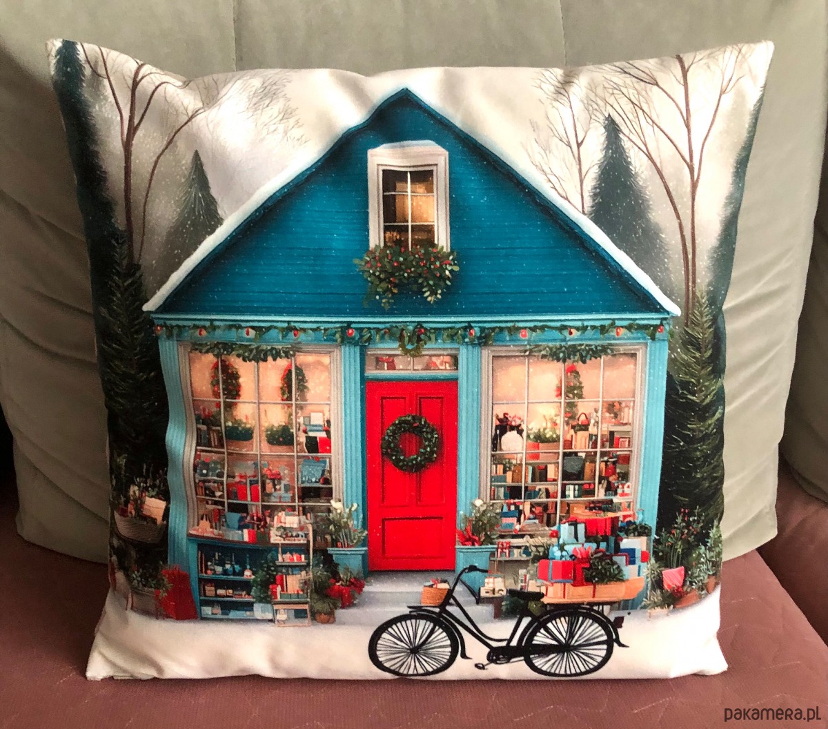 Śliczna poduszka z domkiem na Boże Narodzenie. Z przodu wzór na aksamicie, z tyłu pikowany velvet. Wysokość - szerokość ok. 40 cm.