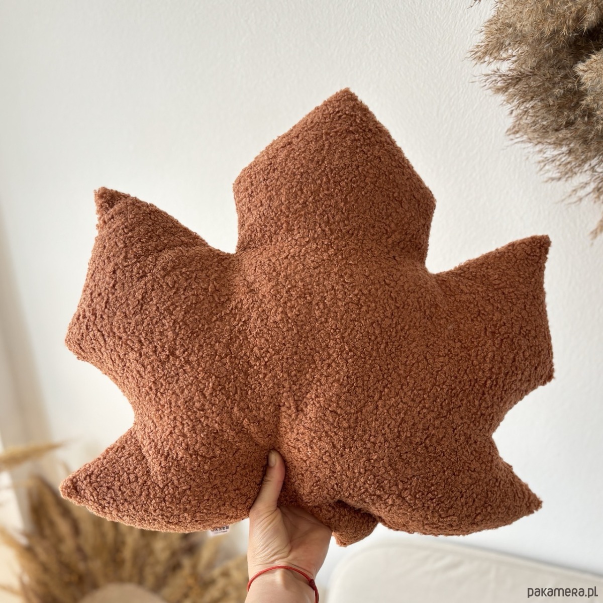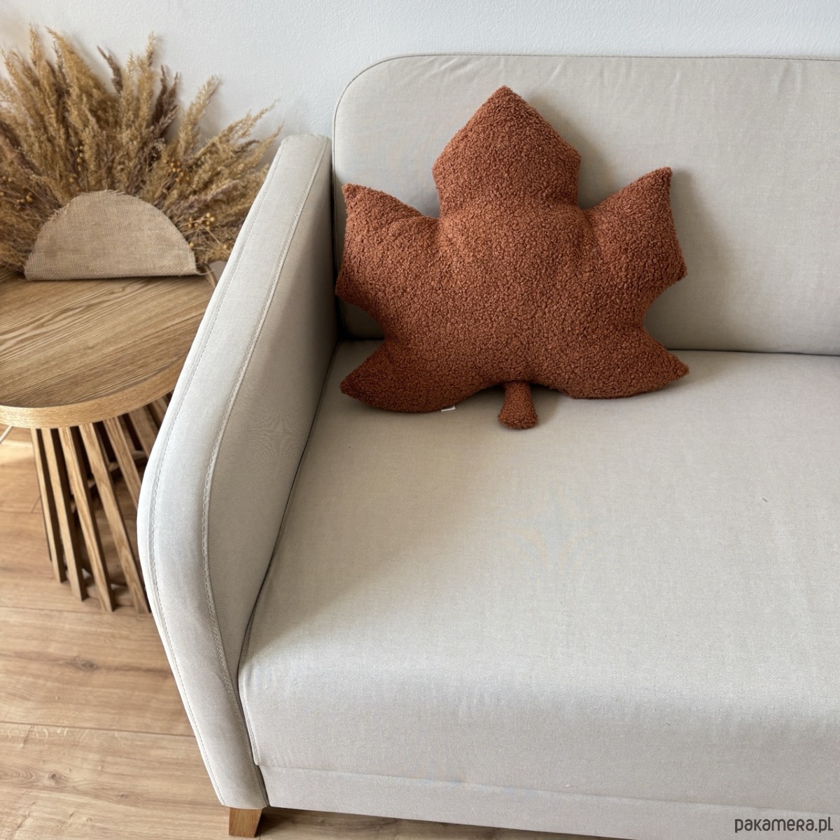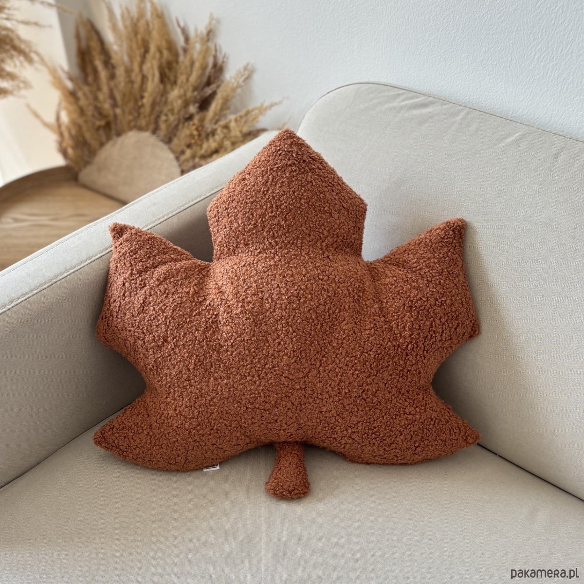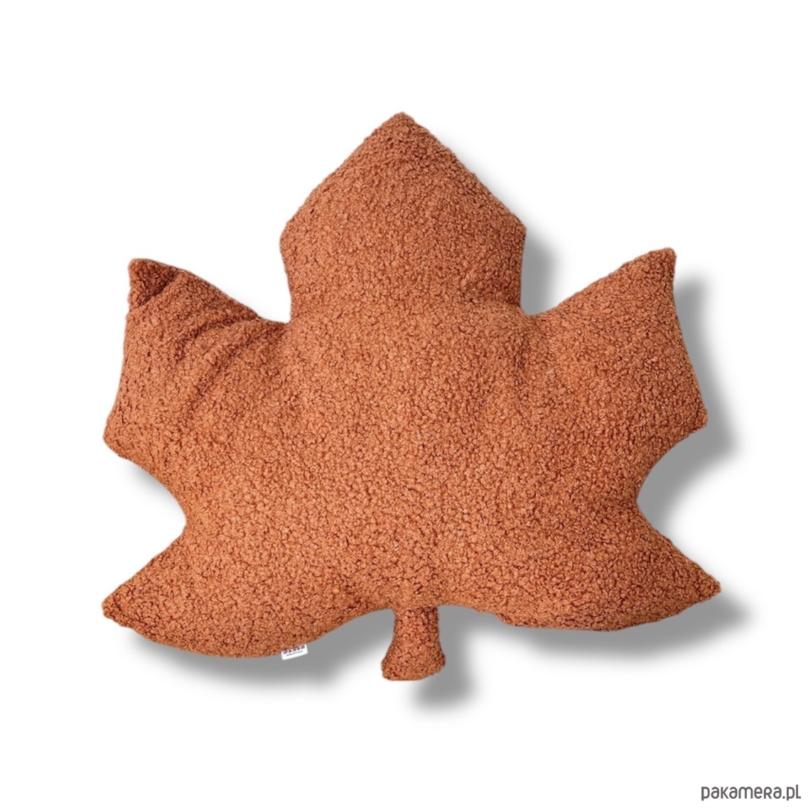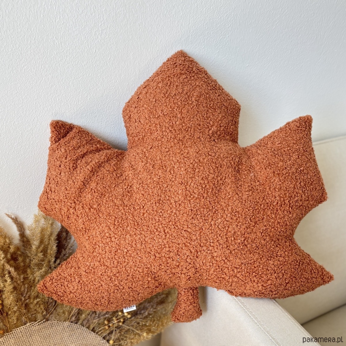 Poduszka jesienna w kształcie minimalistycznego Liścia Klonu w rudym kolorze wykonana z tkaniny boucle baranka