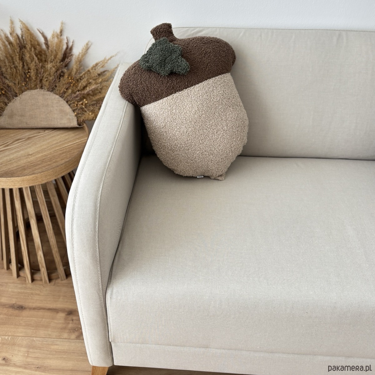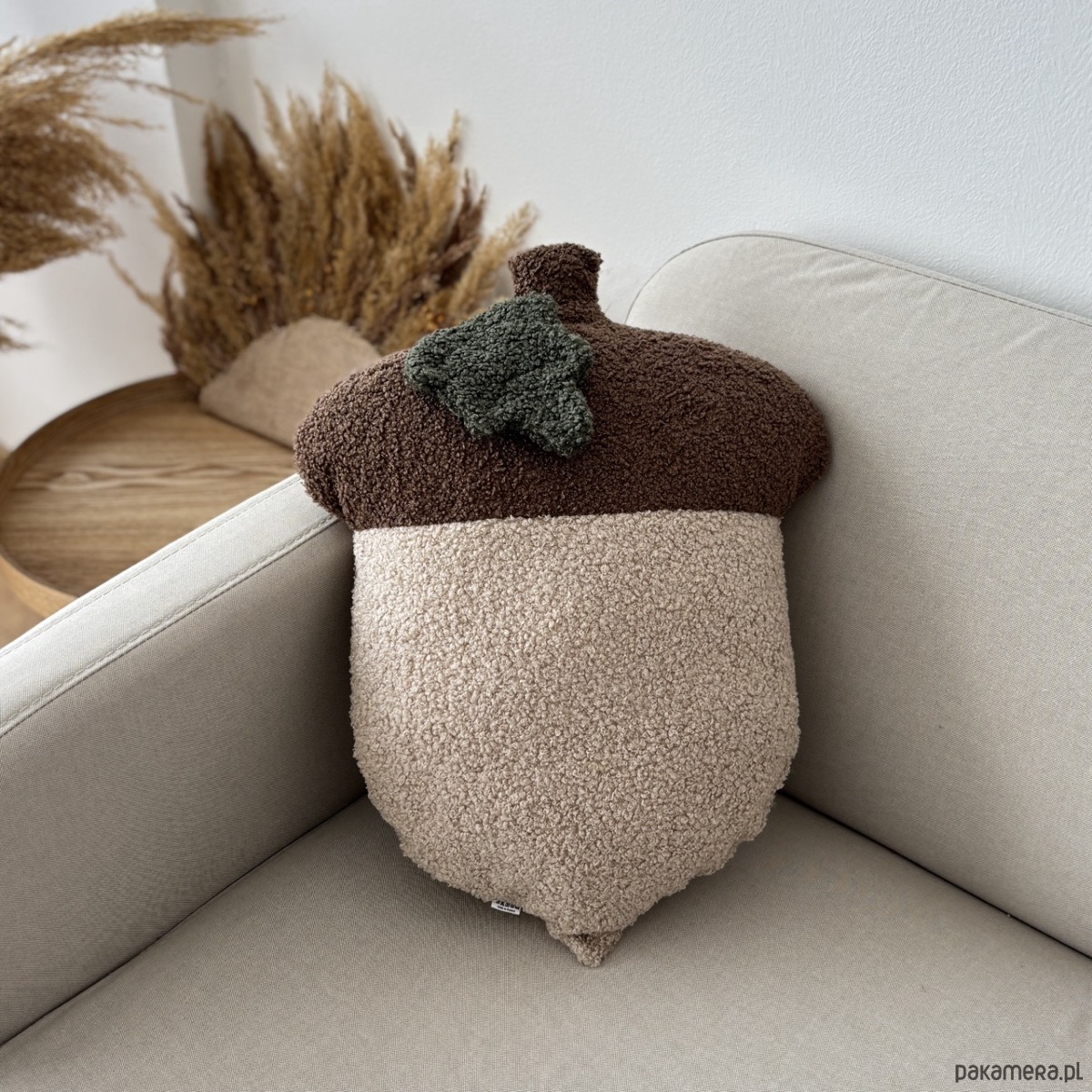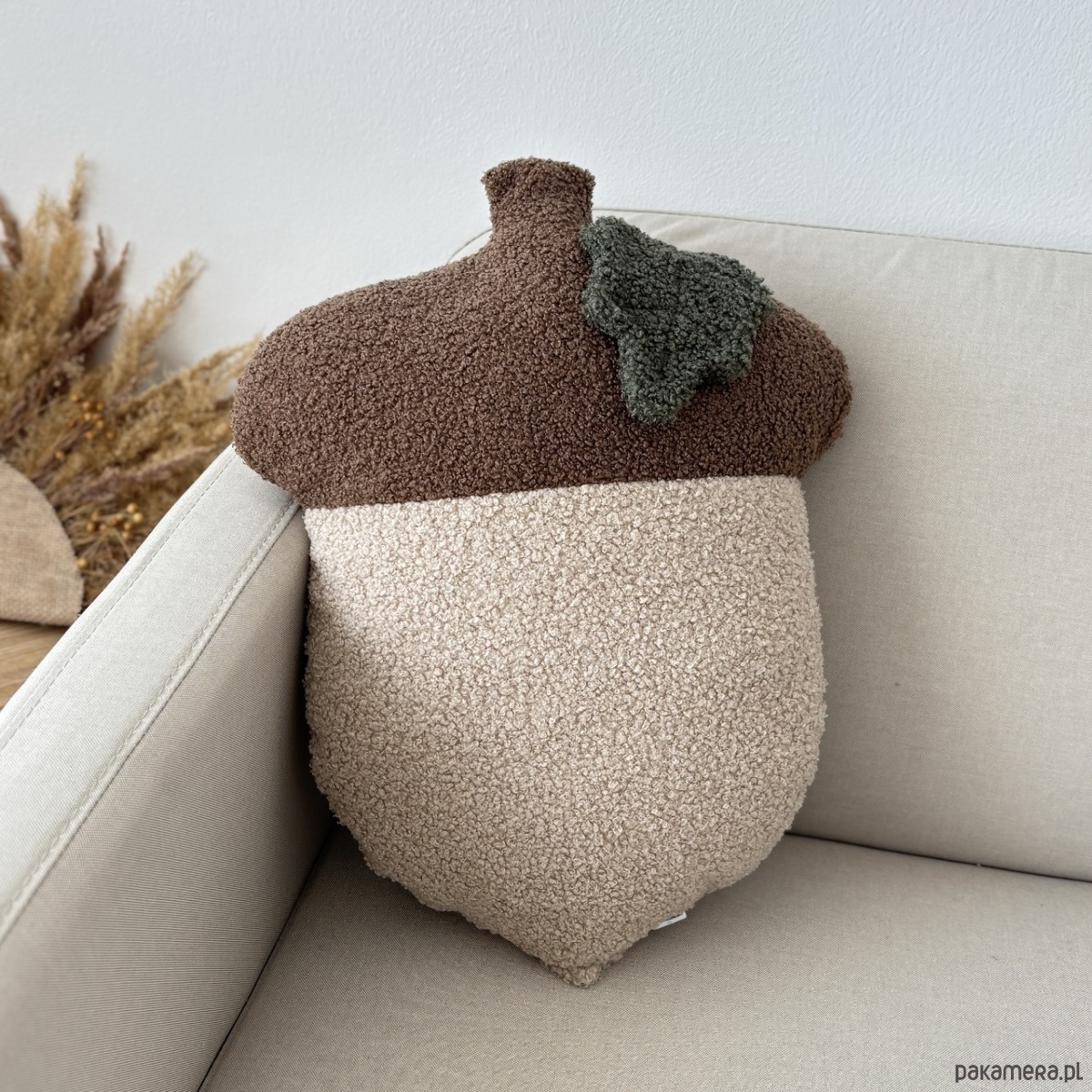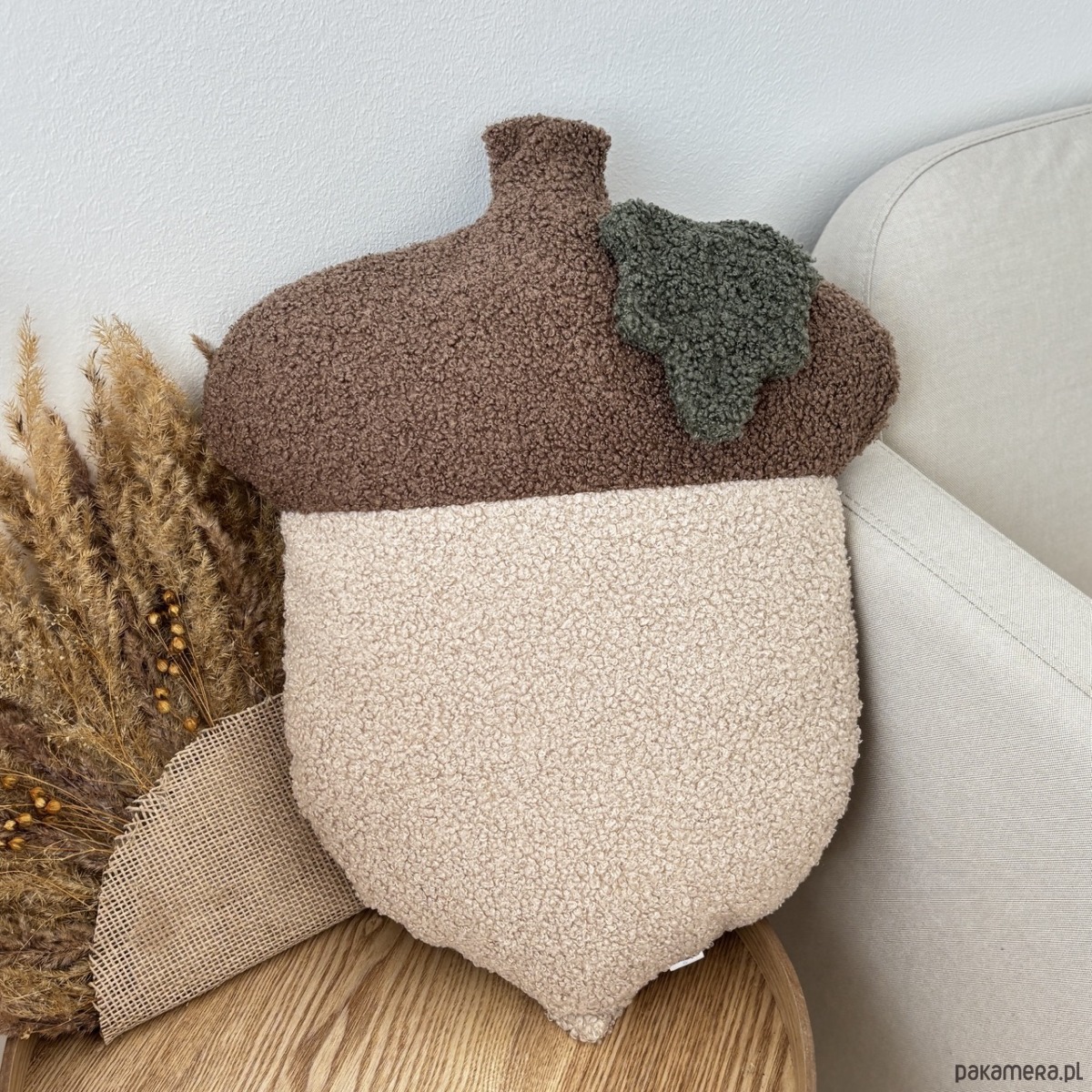 Poduszka w kształcie Żołędzia, to niezwykle uroczy i przytulny dodatek do wnętrz w jesiennym klimacie. Wykonana z tkaniny boucle, przypominającej baranka, zachwyca swoją minimalistyczną formą i unikalną teksturą.