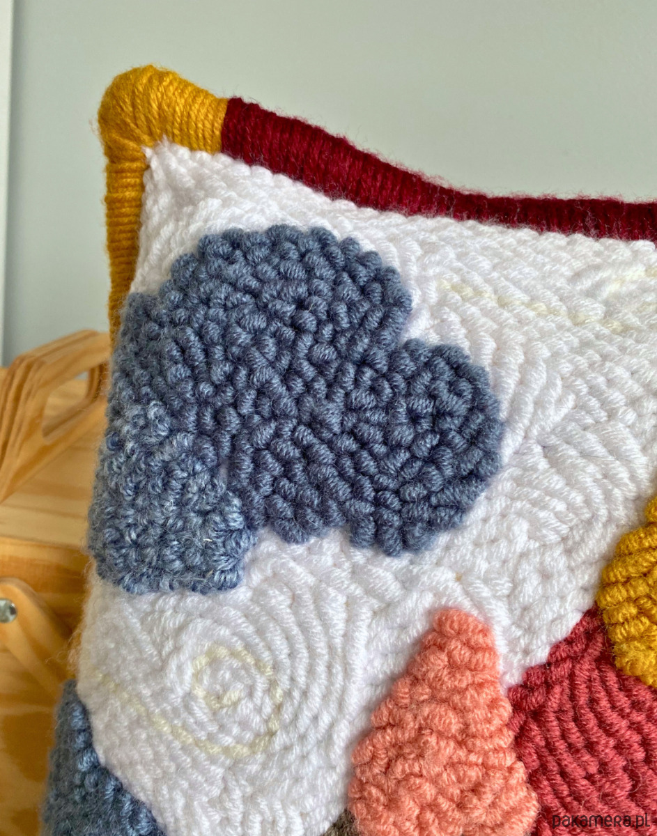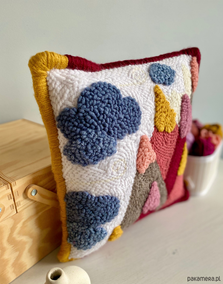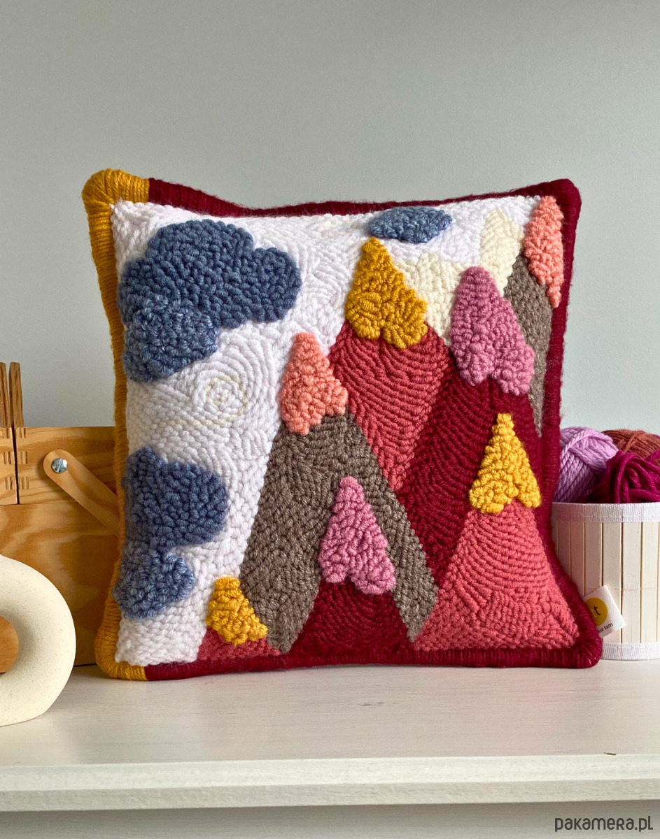 Każdy z nas lubi czasami pobujać w obłokach, a bujanie w obłokach na szczycie góry, to podwójna przyjemność. Jednak nie zawsze możemy stworzyć sobie tak idealne warunki. Dlatego proponuję bujanie w obłokach z poziomu kanapy w towarzystwie poduszki KOLOROWE GÓRY. Została ręcznie wyhaftowana techniką punch needle. Wylewają się z niej kolory. Jest bardzo przytulna i nie pozostaje obojętna dla wnętrza, w którym się znajdzie. To autorski wzór, który powstał tylko raz, a to oznacza, że nie ma drugiej takiej poduszki. To sprawia, że jest wyjątkowa.