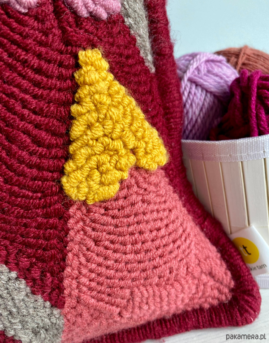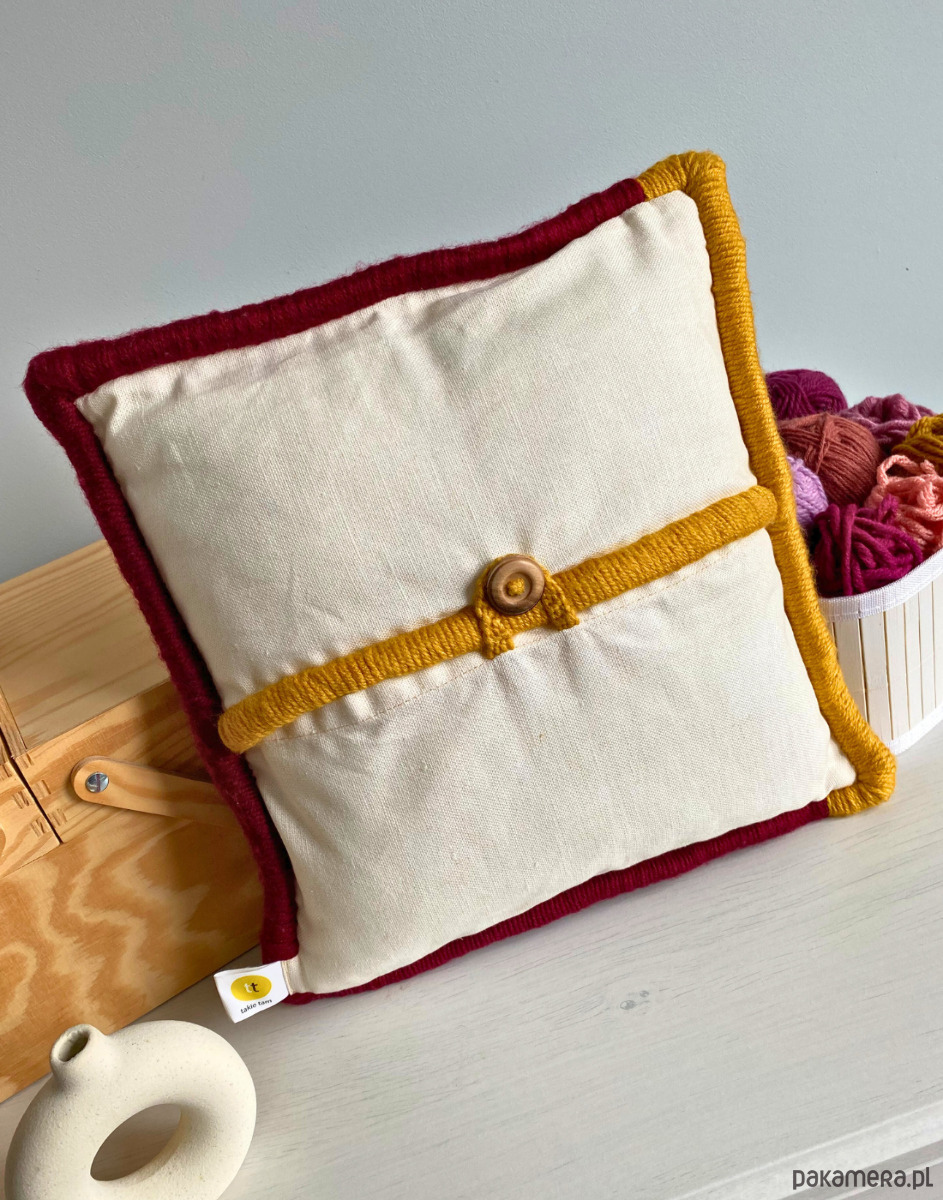 - poduszka dodatkowo jest dekoracyjnie obszyta włóczką i zapinana na guzik