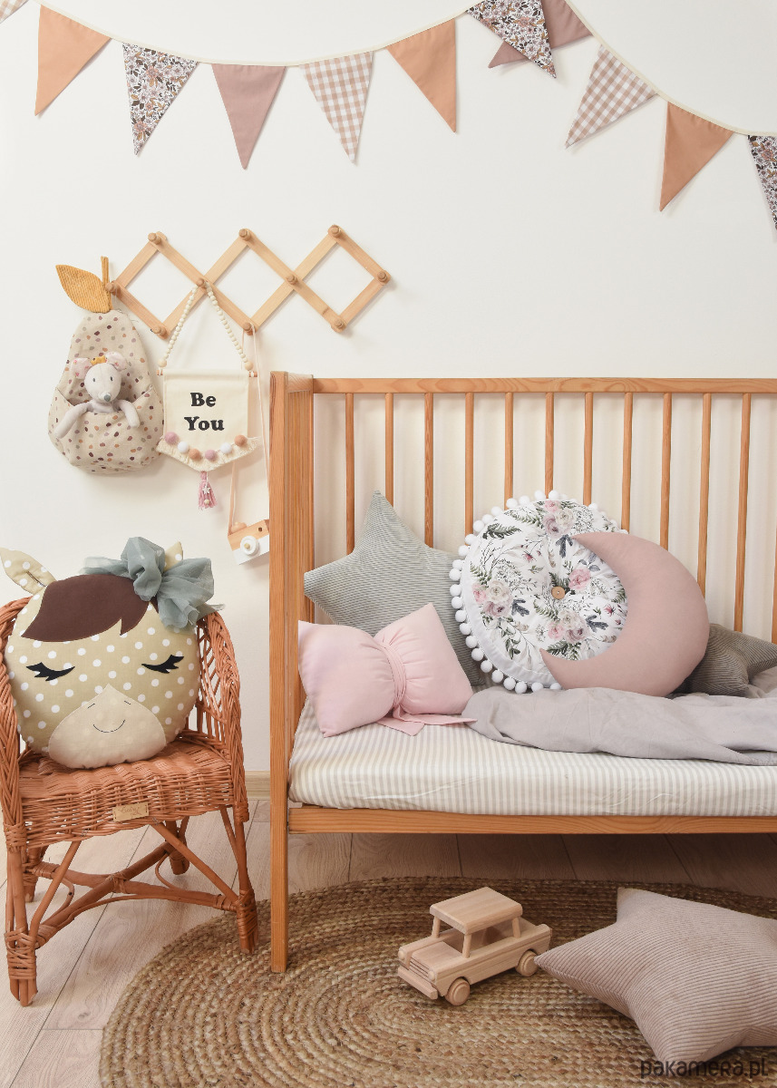 Poduszka w kształcie konika uszyta z bawełnianych tkanin, tiulu oraz filcu. Całość solidnie wypełniona antyalergiczną kulką silikonową.