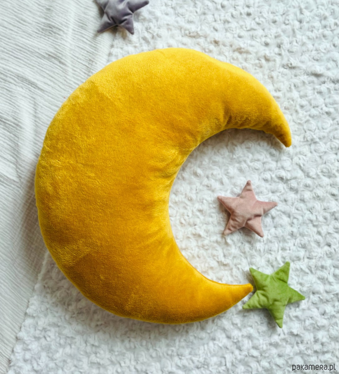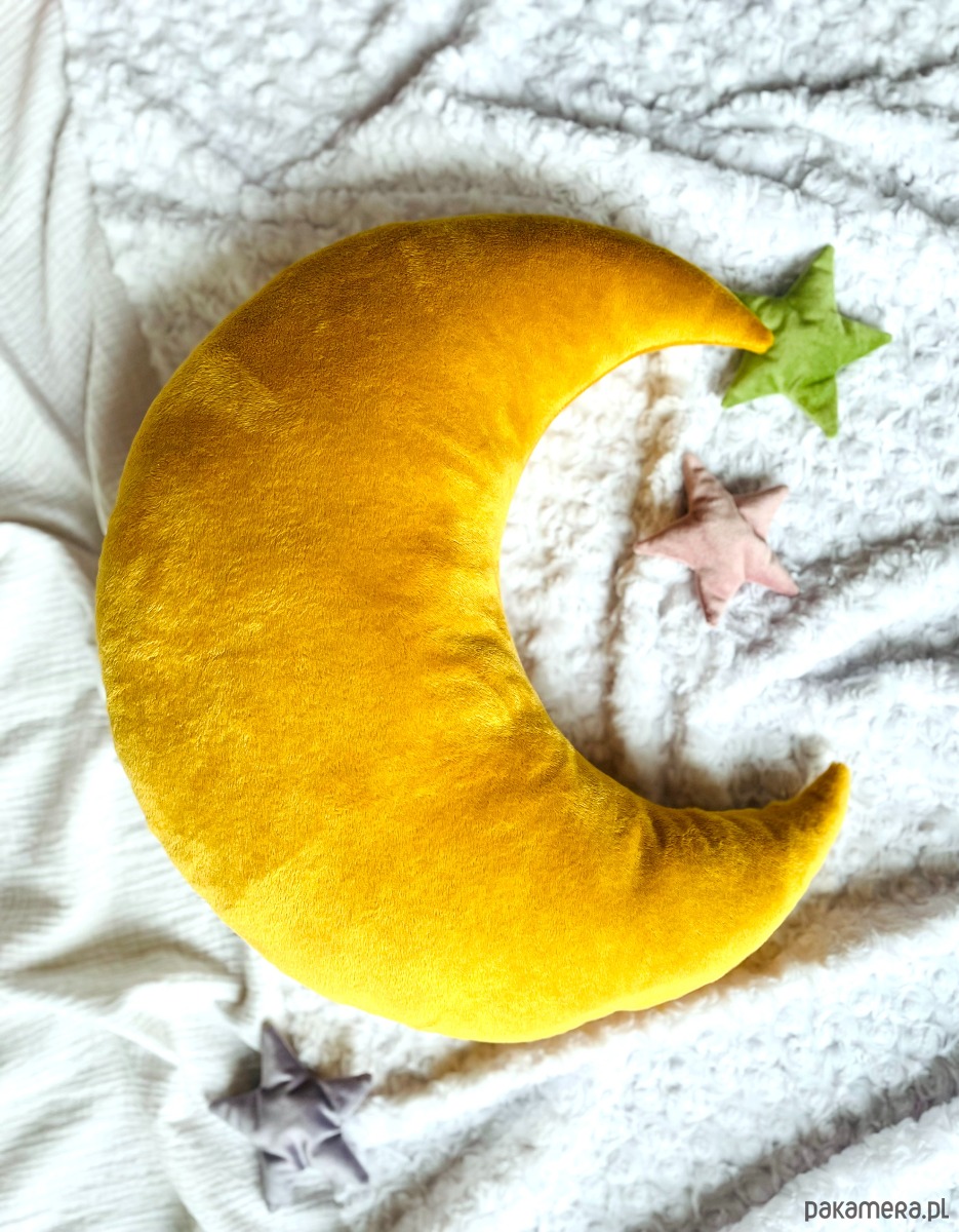 Dodaj przytulny akcent do swojego wnętrza z miękką, żółtą poduszką w kształcie księżyca! Idealnie sprawdzi się jako dekoracja łóżeczka, przytulanka na dobranoc lub wygodne oparcie podczas zabawy.