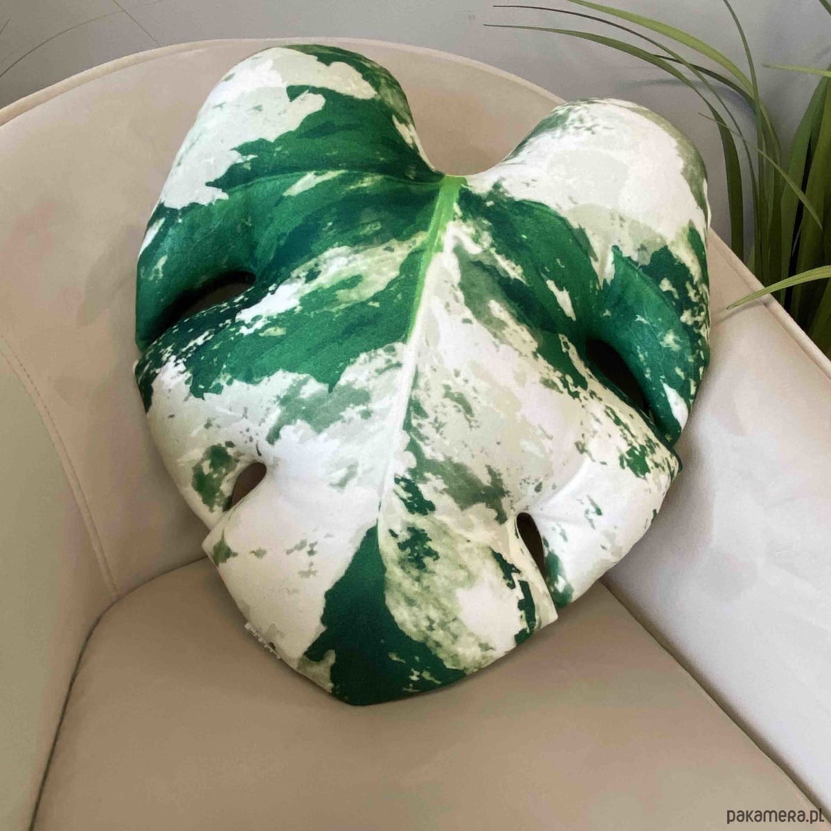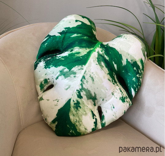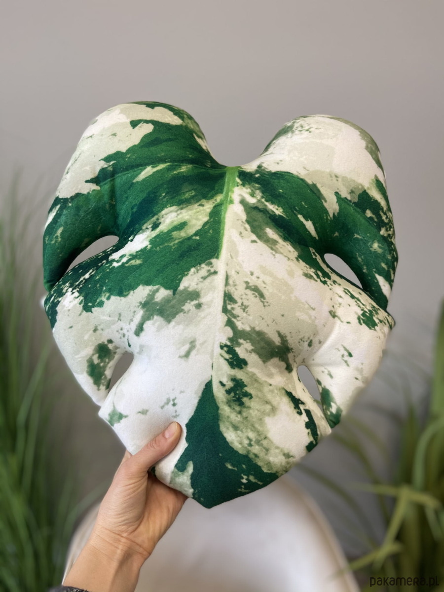 Poduszka w kształcie unikatowego liścia Monstery w najbardziej kolekcjonerskiej odmianie deliciosa Variegata, przepiękna intensywna zieleń z przenikającymi się biało-zielonymi plamkami, które są genetyczną mutacją oznaczającymi tzw. variegację.