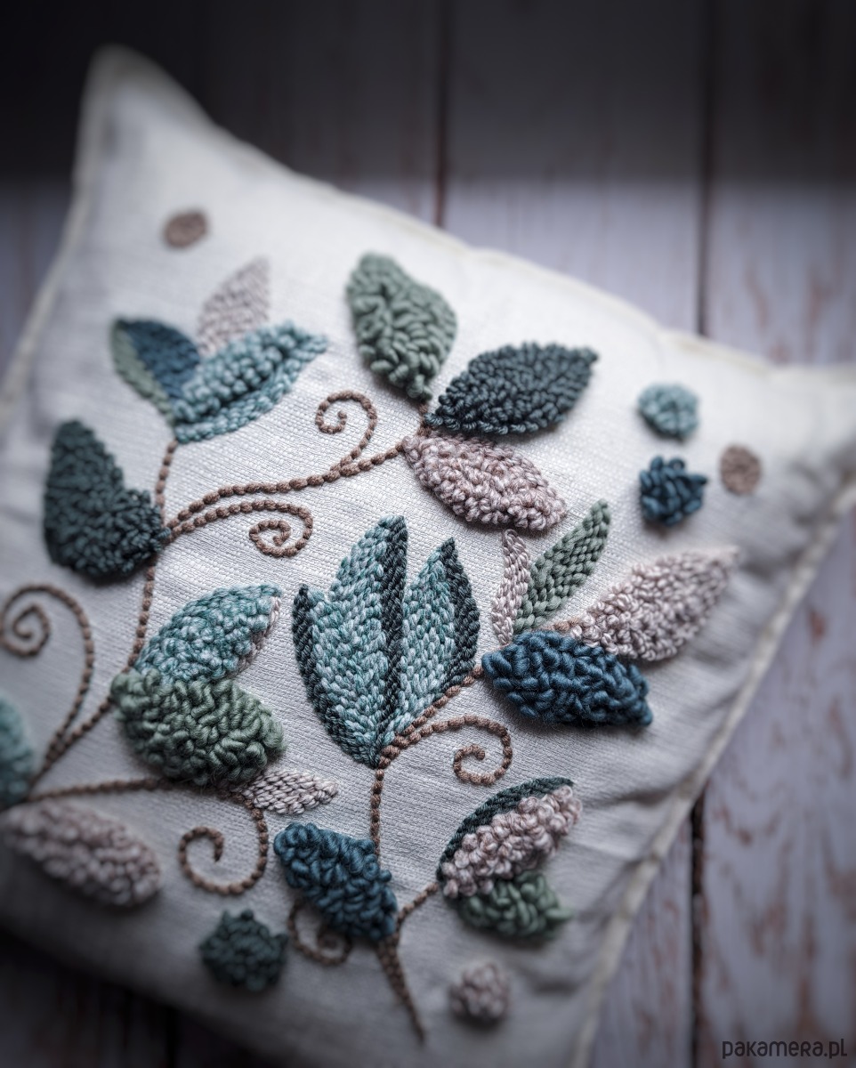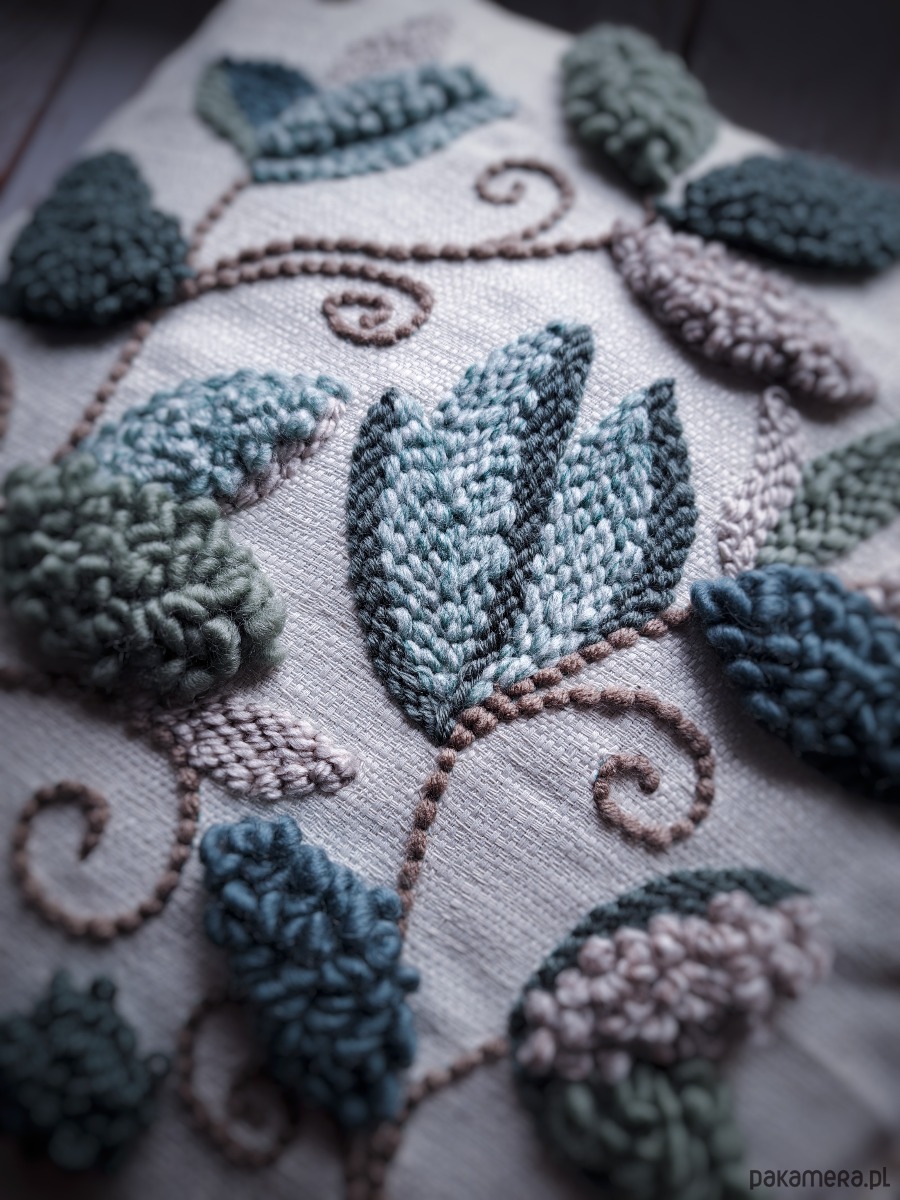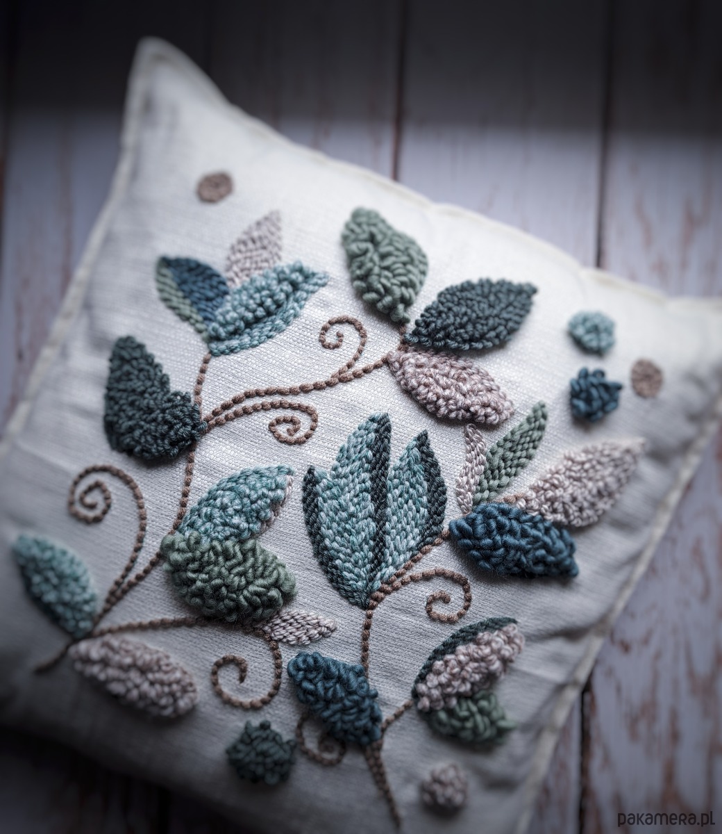Ręcznie wykonana poduszka w technice punch needle, w ciepłych, beżowych i zielonych barwach.