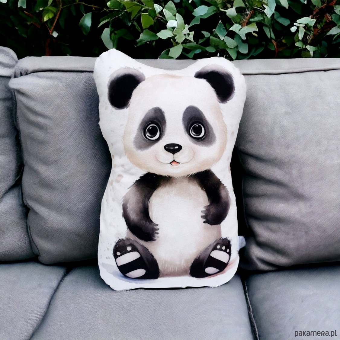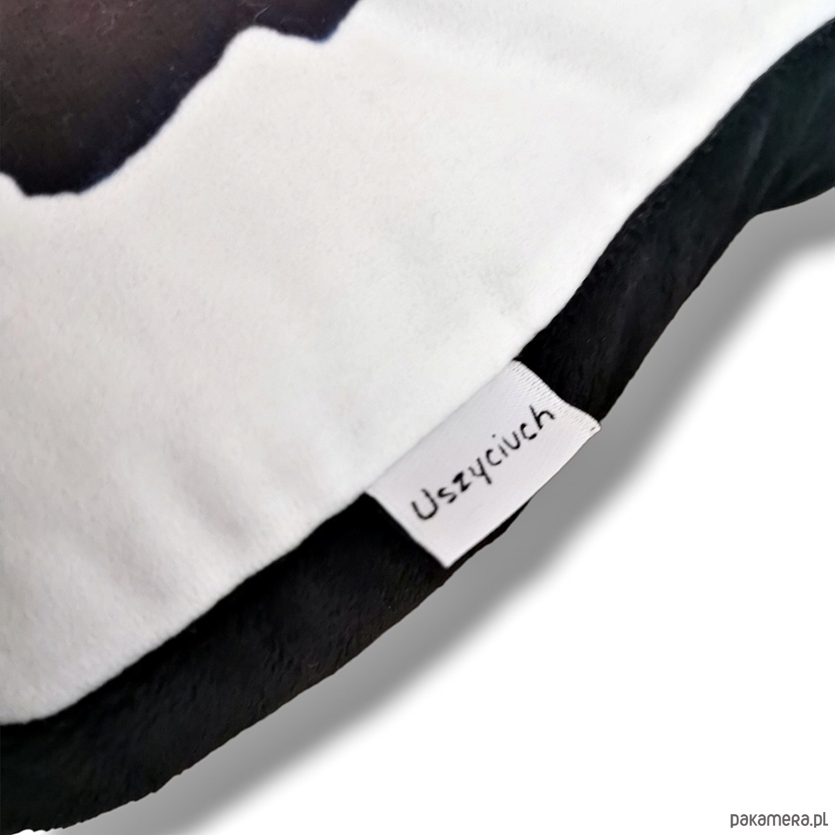 Stylowa ozdobna poduszka uszyta z mikrofazy z wzorem pandy i z mięciutkiego gładkiego polaru minky w kolorze czarnym.