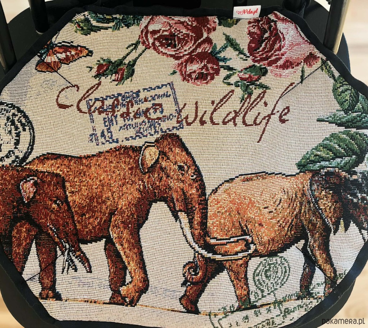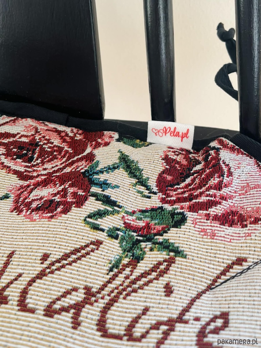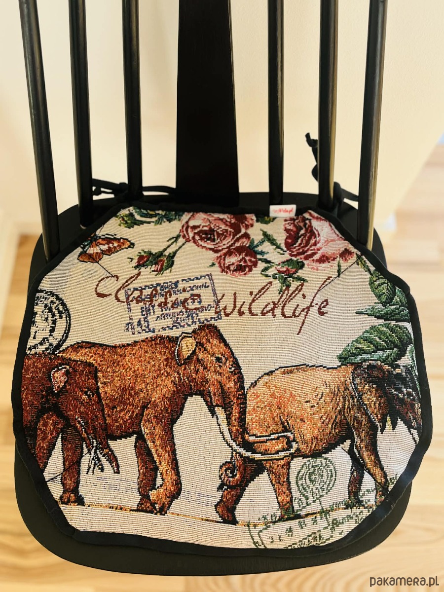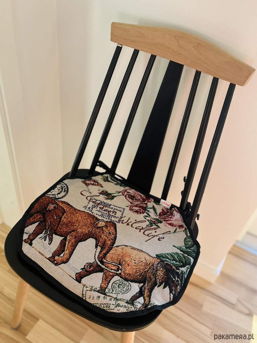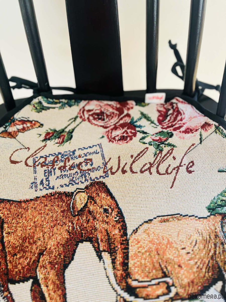 Zaprojektowana w eleganckiej czarno-beżowej kolorystyce, z motywami kwiatów i dzikiej przyrody, zamienia każde krzesło w przytulne i stylowe miejsce — idealne do kuchni, jadalni czy kącika do czytania.