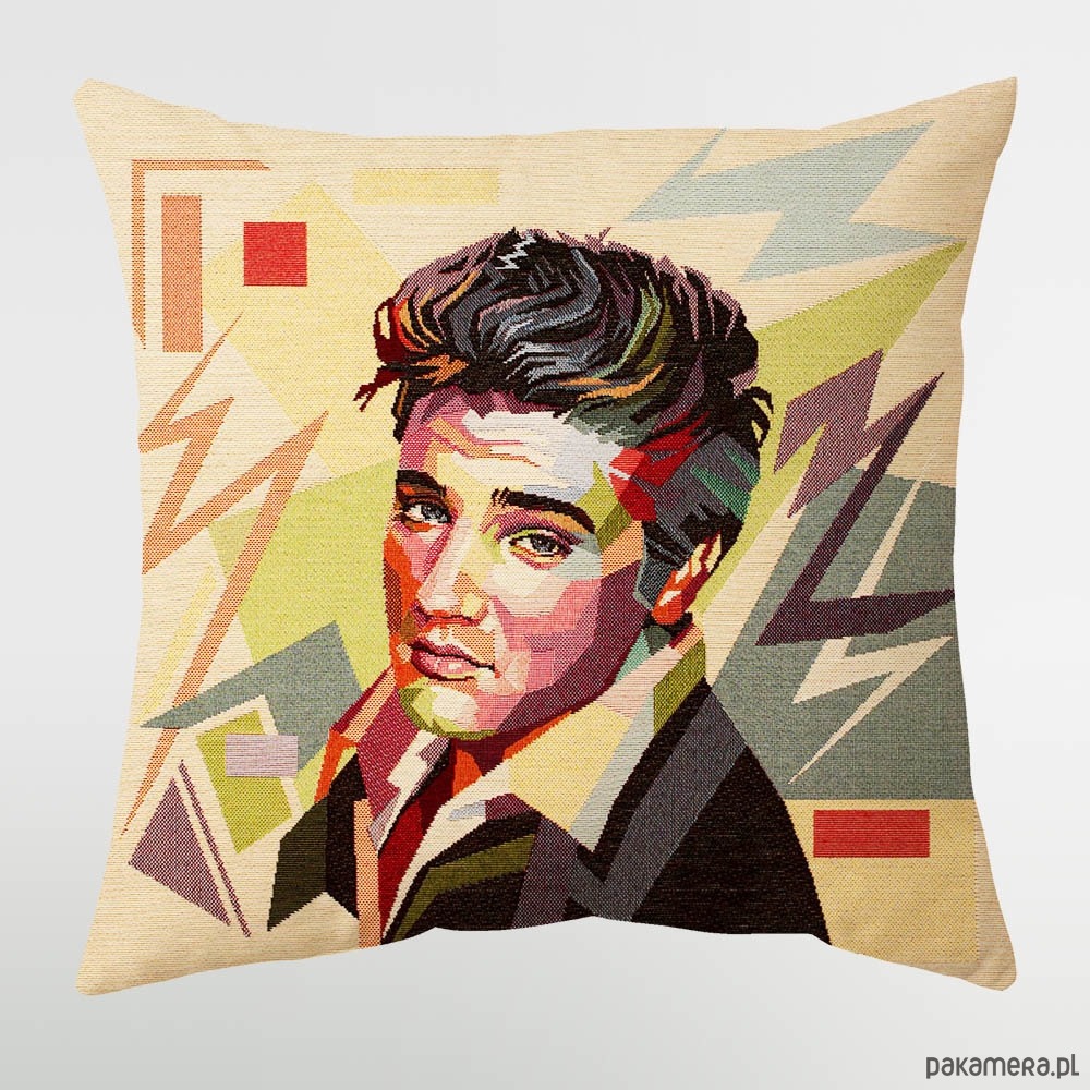 Śliczna poduszka z Elvisem Presleyem. Z przodu gobelinowy wzór, z tyłu pikowany velvet. Wysokość - szerokość ok. 40 cm.