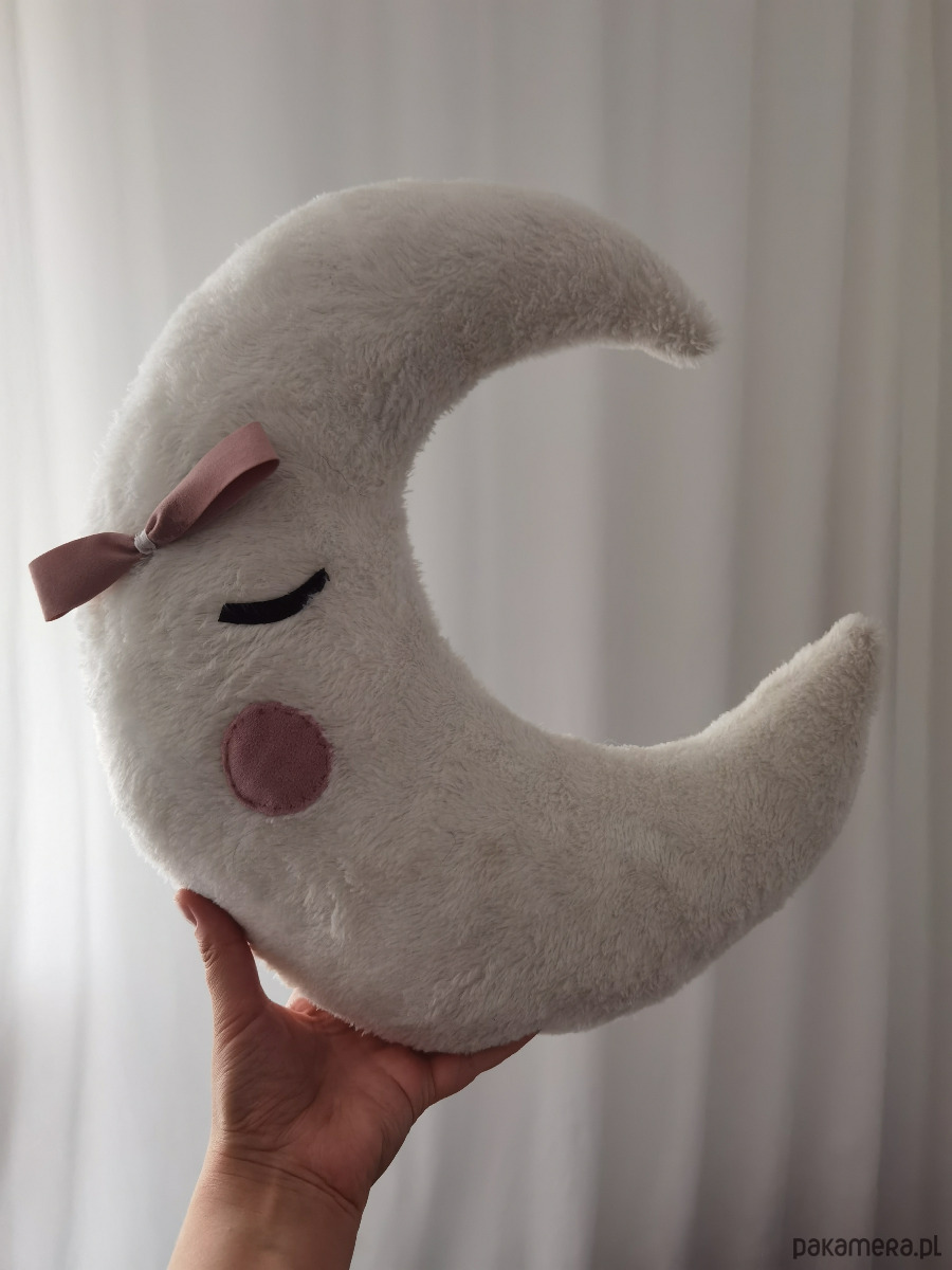 Poduszka ozdobna w kształcie księżyca. Piękna dekoracja do pokoju. Przytulanka do spania. Towarzysz zabaw. Wykonany z przyjemnego w dotyku minky, velvetu lub bawełny, muślinu. Wypchany antyalergicznym puchem. Księżyc może mieć buźkę, koronę, wianek z kwiatków, kokardkę, chwost albo wyhaftowany napis. Wszystkie szczegóły jak tkanina, kolor, dodatki, czcionka, kolor napisu do uzgodnienia. Jeśli nie posiadamy tkaniny w kolorze jaki Państwu odpowiada - zamówimy inny.