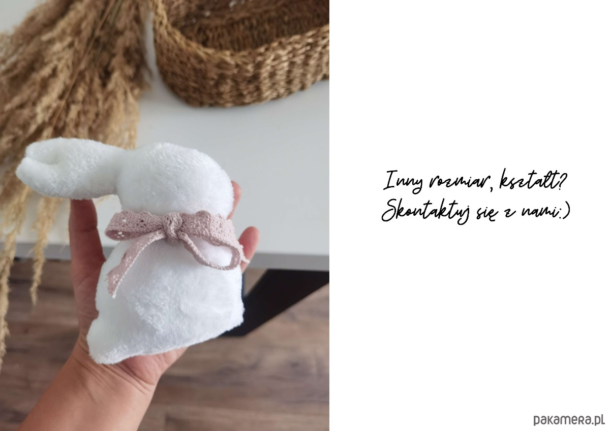 Króliczka możemy uszyć z tkaniny velvetowej, z minky jak i bawełny, muślinu. Wystarczy podać preferowaną kolorystykę a my wyślemy dostępne odcienie. W przypadku braku odpowiedniego koloru - zamówimy. Króliczki ze zdjęć wykonane są pluszowego minky . Tkanina bardzo miła w dotyku - aż chce się je tulić. Jednak ze względu na swoją fakturę nie możemy wykonać na nich haftu. W przypadkach gdy haft jest niemożliwy do wykonania na maskotce - napis umieszczamy na kokardce. Przed wykonaniem haftu przygotowujemy wizualizację napisu w różnych czcionkach do wyboru, ustalamy też kolor napisu. Rozmiar króliczka : 30 x 35 cm. Inny wymiar, kształt? Zrobimy wszystko żeby pomóc.