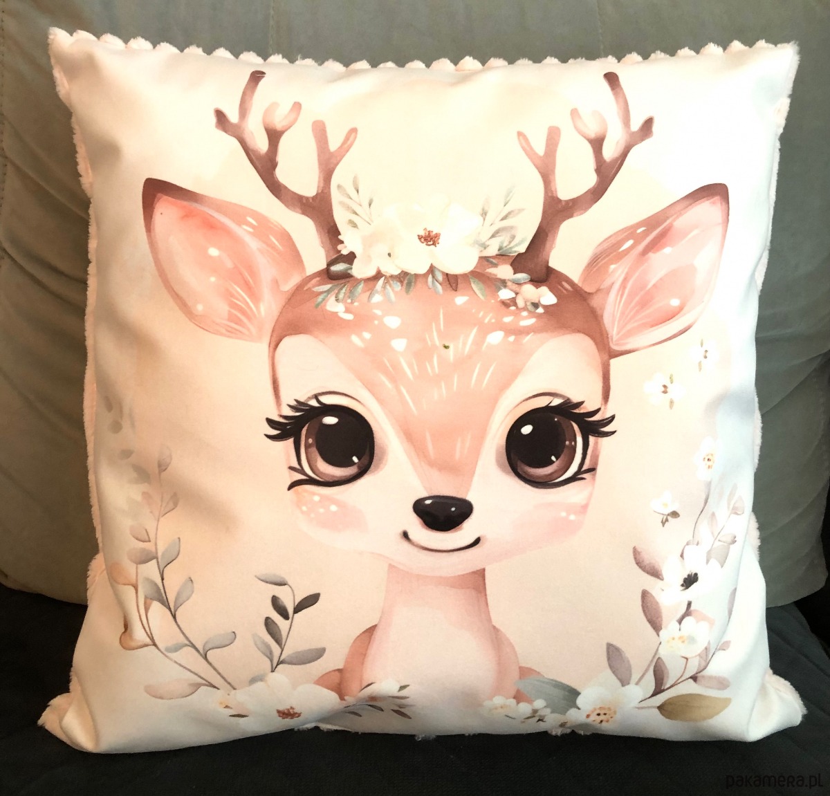 Śliczna poduszka z jelonkiem. Z przodu wzór na welurze, z tyłu pikowany velvet. Wysokość - szerokość ok. 45 cm.