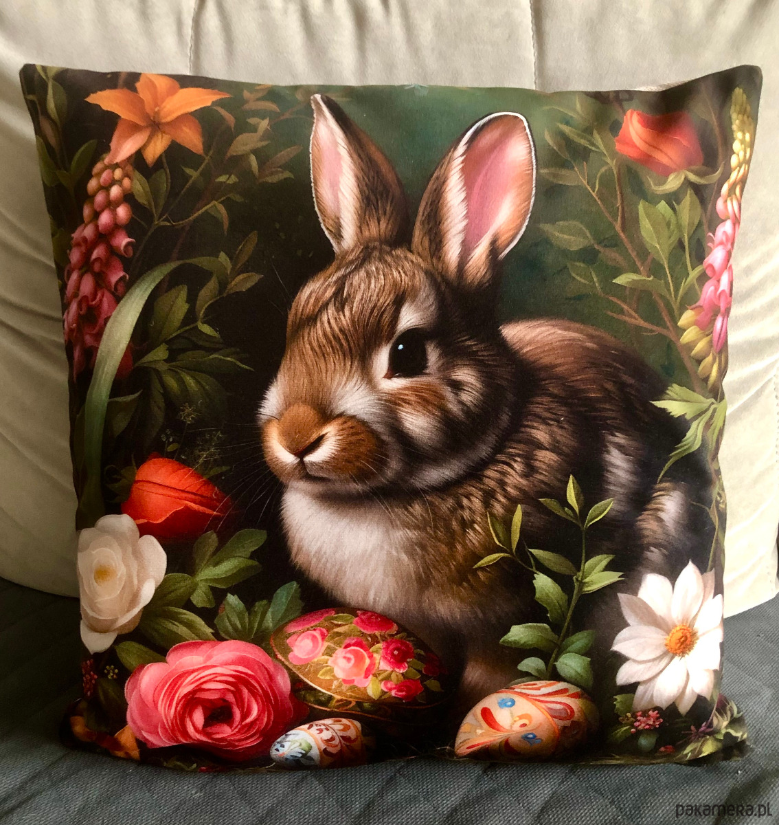 Śliczna poduszka z królikiem. Z przodu wzór na aksamicie, z tyłu pikowany velvet. Wysokość - szerokość ok. 40 cm.