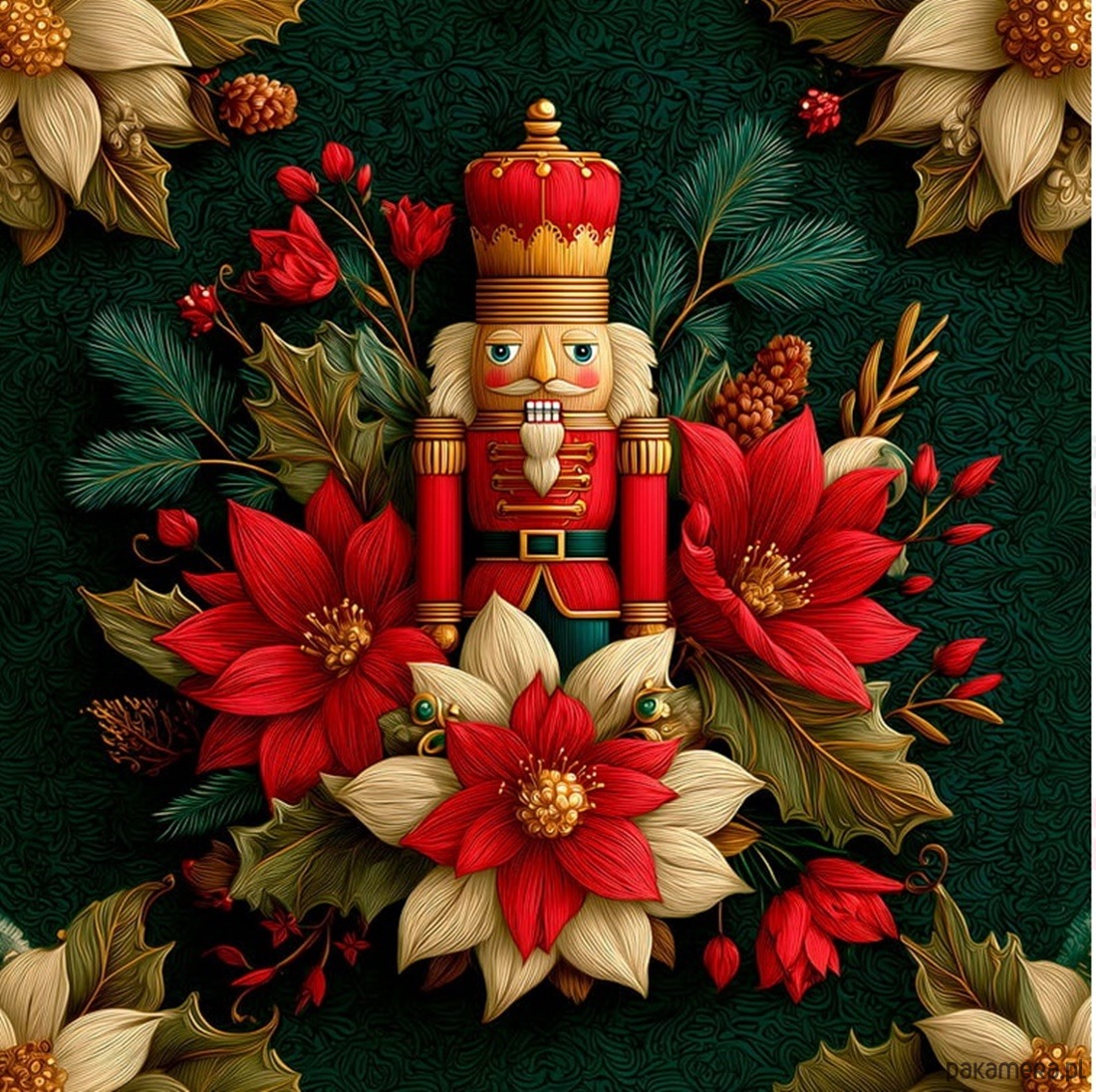 Śliczna poduszka z dziadkiem do orzechów. Z przodu wzór na welurze, z tyłu pikowany velvet. Wysokość - szerokość ok. 45 cm.