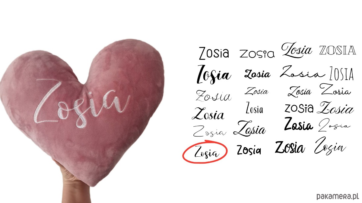 Na poduszcze haftujemy dowolny krótki napis w wybranej czcionce i kolorze. np.
