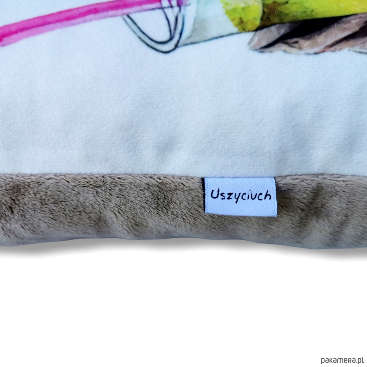 Stylowa ozdobna poduszka uszyta z mikrofazy z wzorem pieska i z mięciutkiego polaru minky w kolorze beżowym.