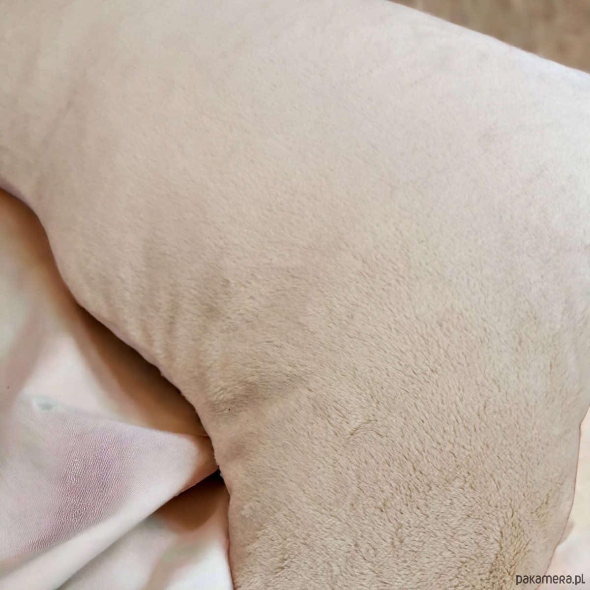 Stylowa ozdobna poduszka uszyta z mikrofazy z wzorem pieska i z mięciutkiego polaru minky w kolorze beżowym.