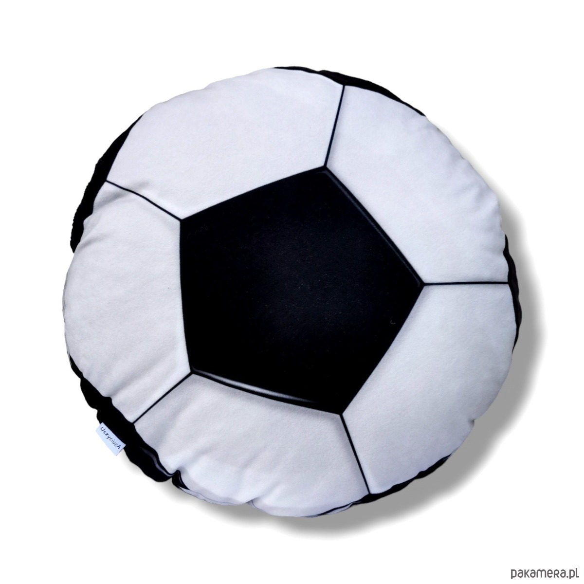 Stylowa ozdobna poduszka uszyta z mikrofazy z wzorem piłki nożnej i z mięciutkiego polaru minky w kolorze czarnym.