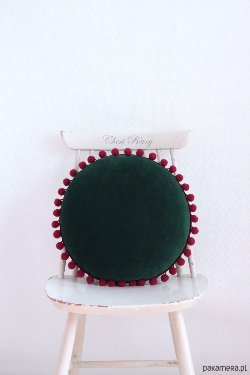 Poduszka świąteczna welur okrągła z pomponami vintage butelkowy zielony