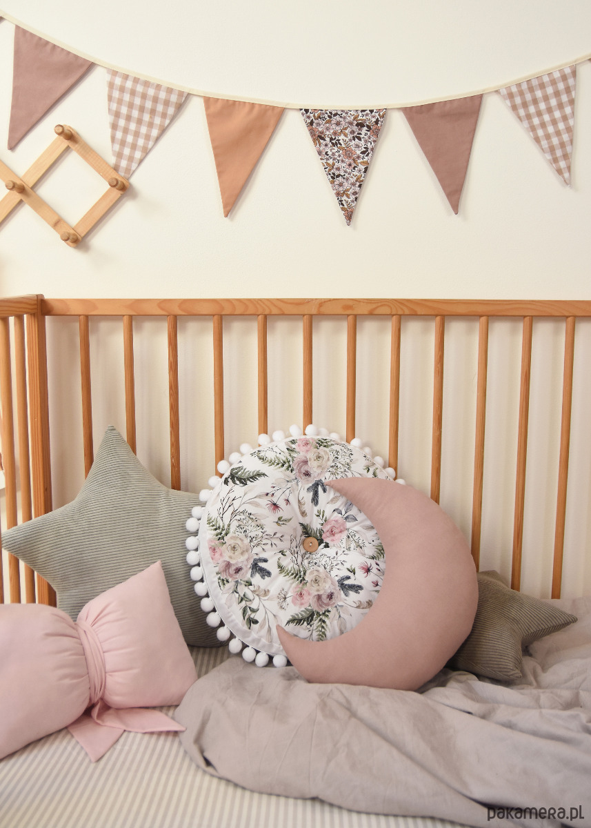 Poduszka dekoracyjna w kształcie księżyca w kolorze brudnego różu.
