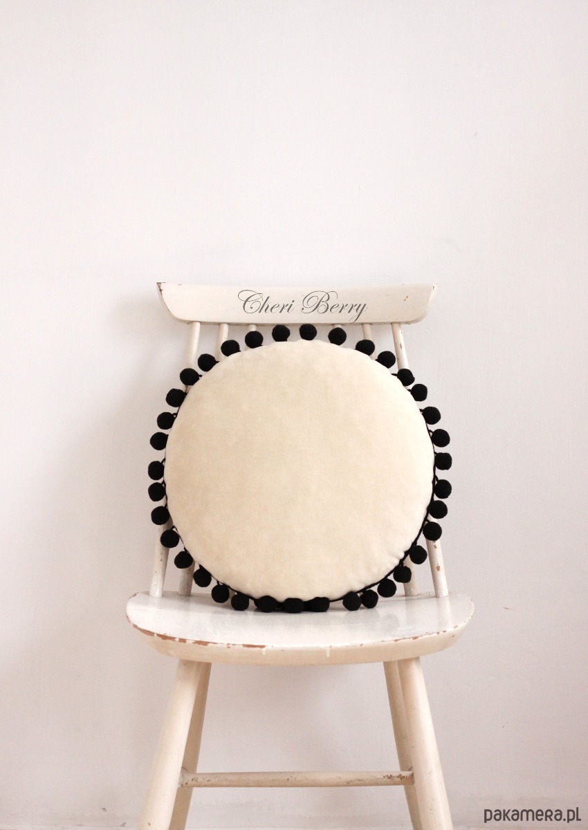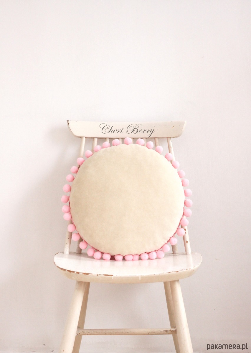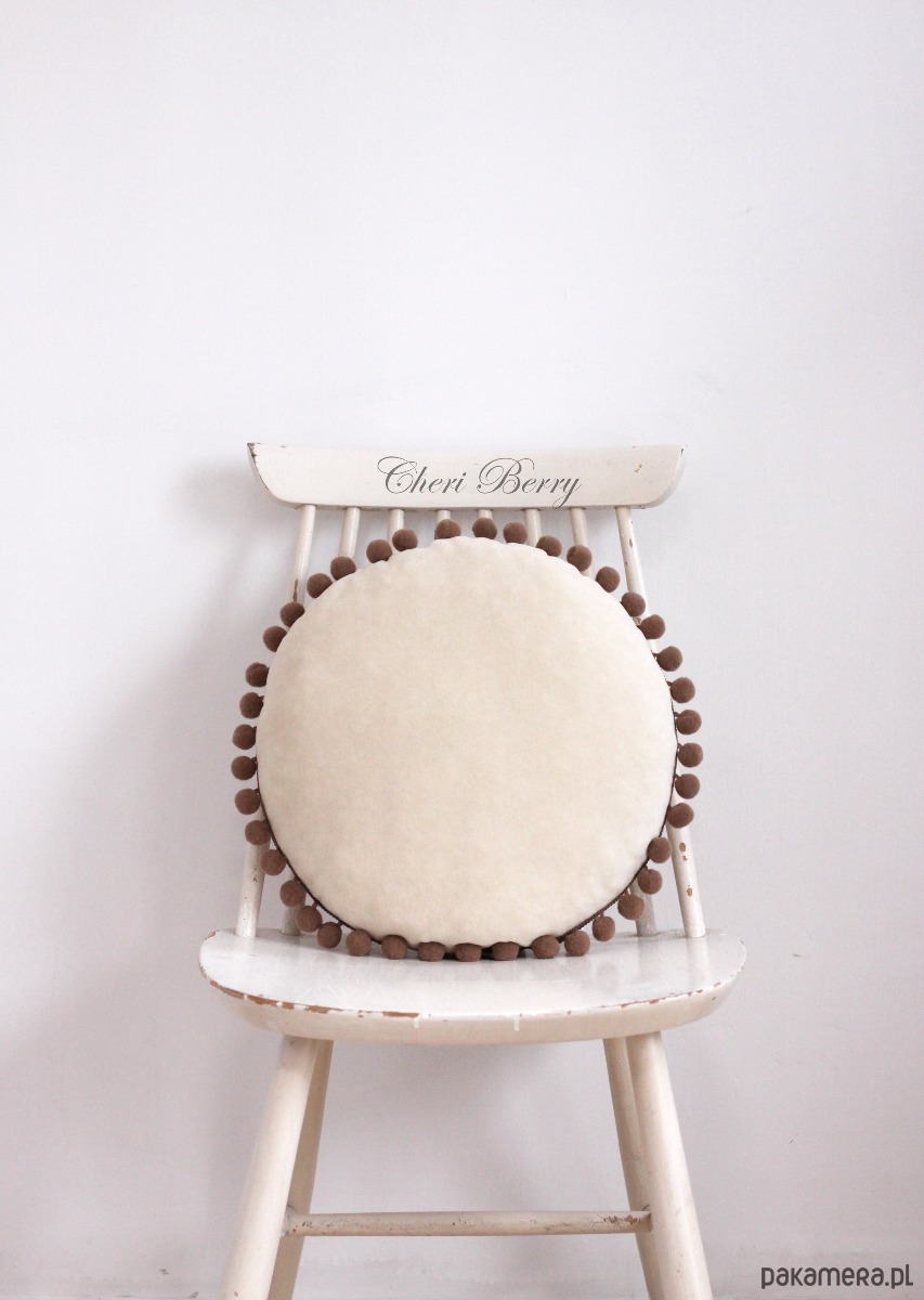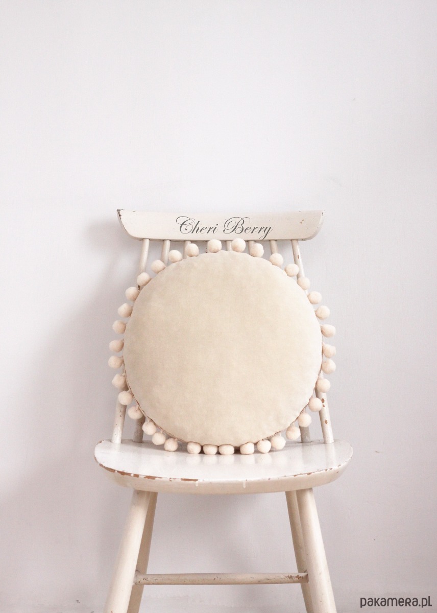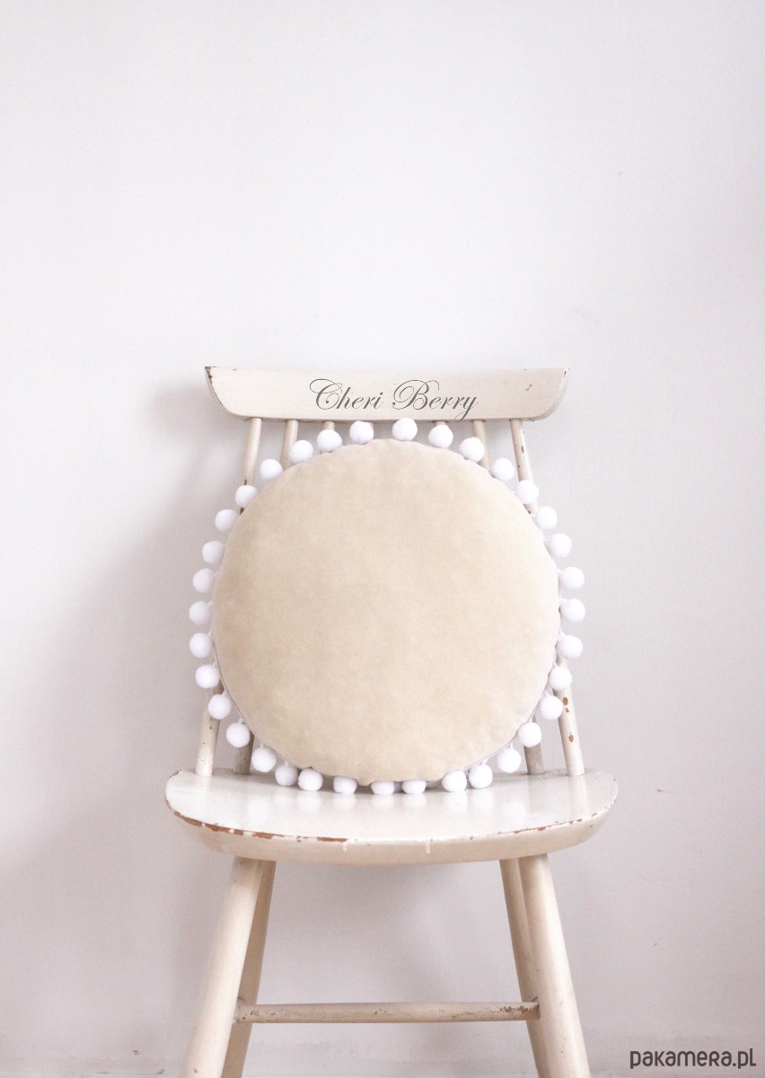 Poduszka welur okrągła z pomponami boho beżowa
