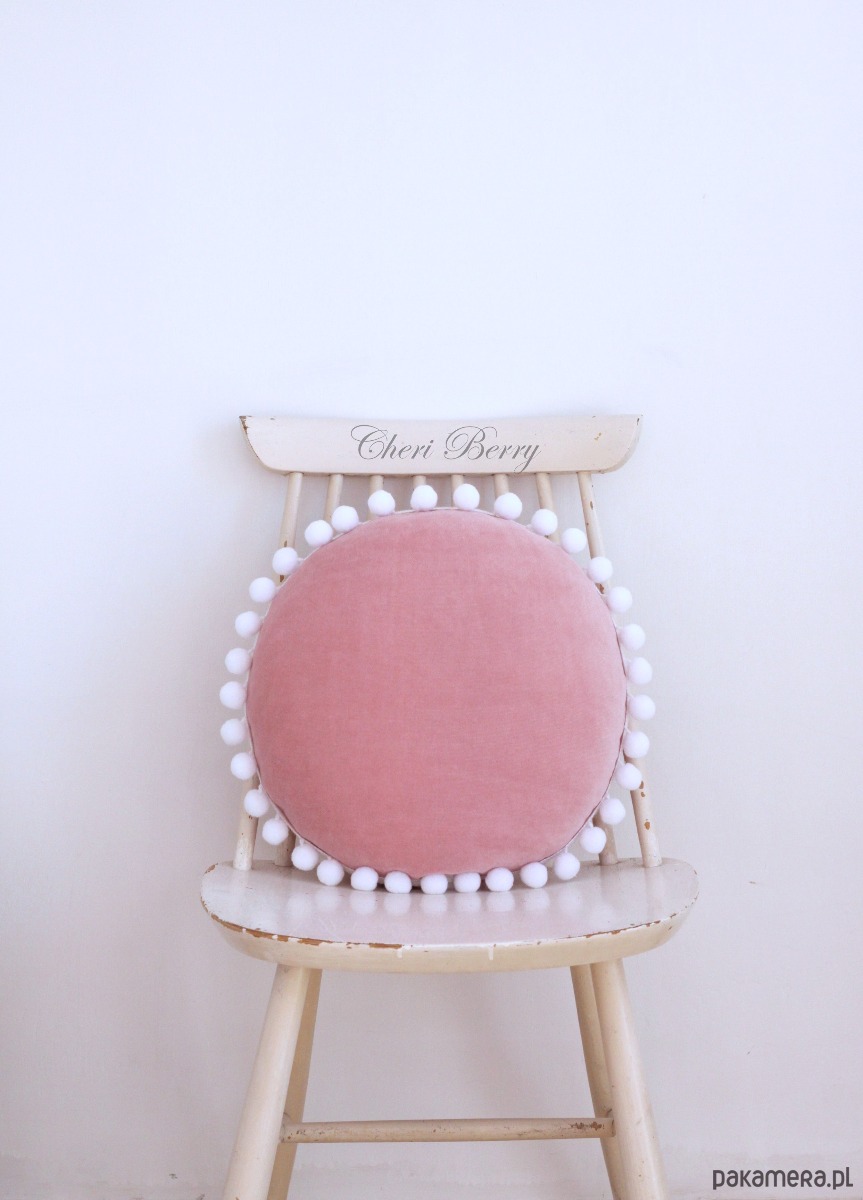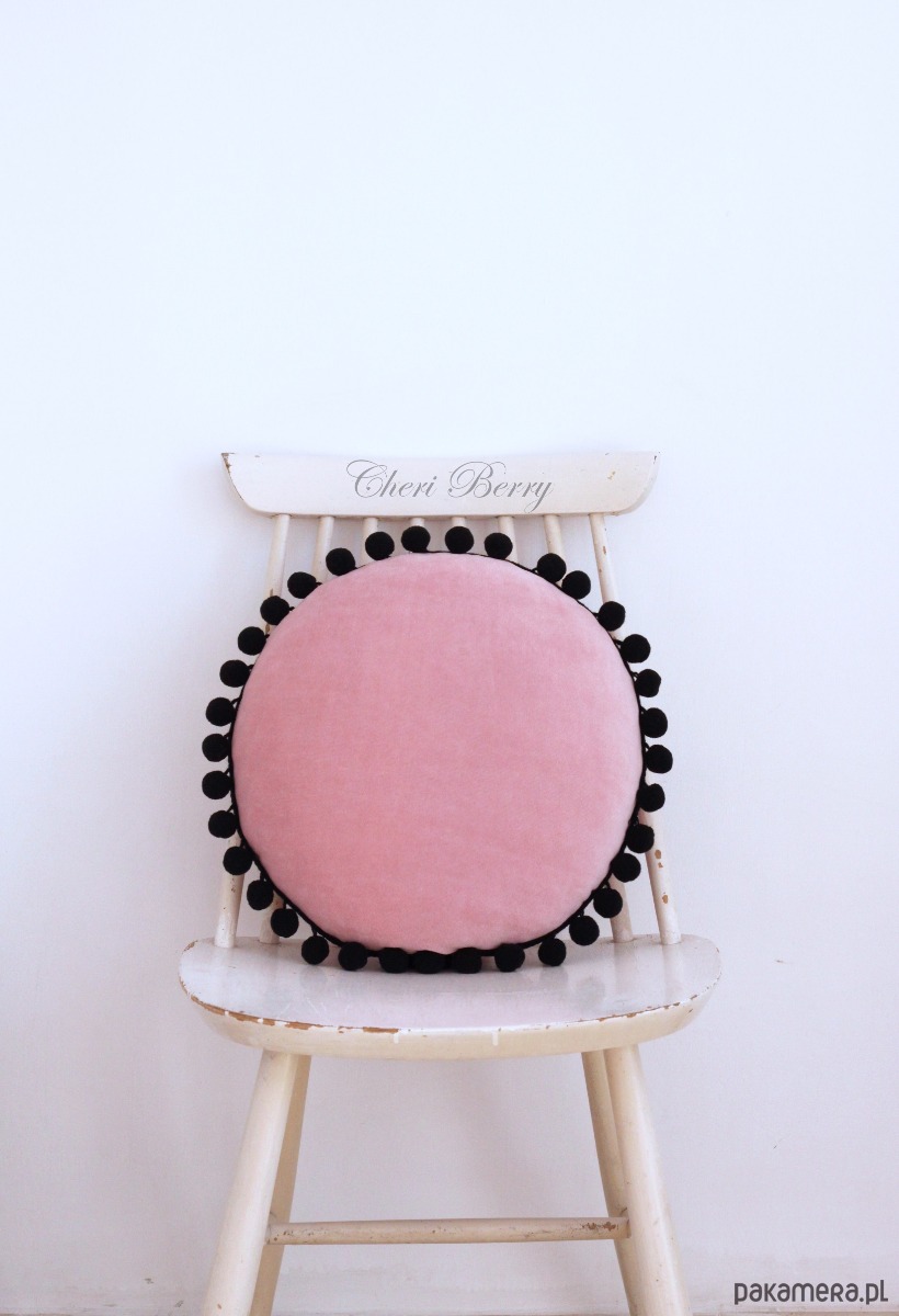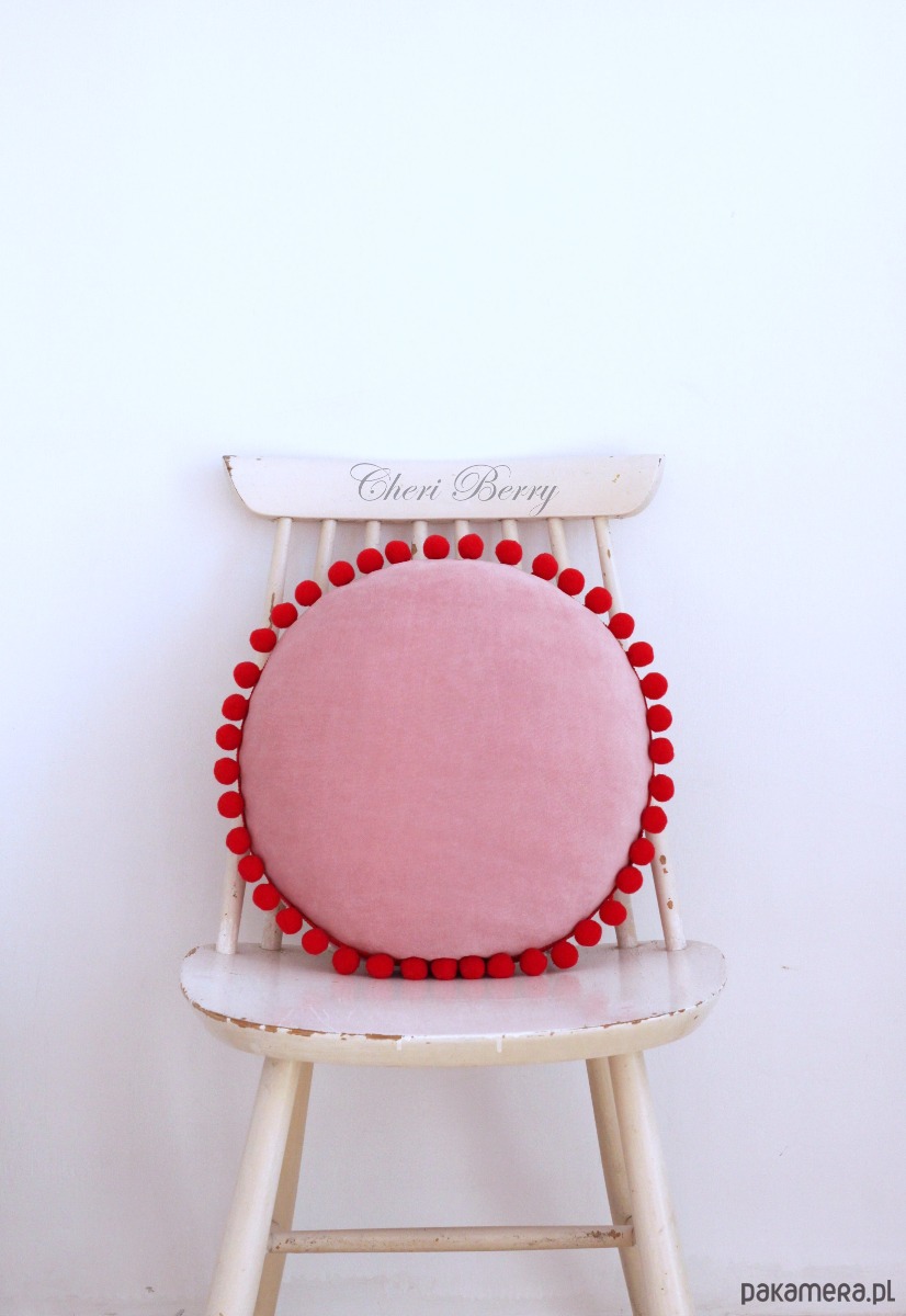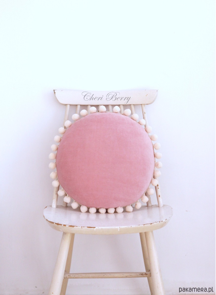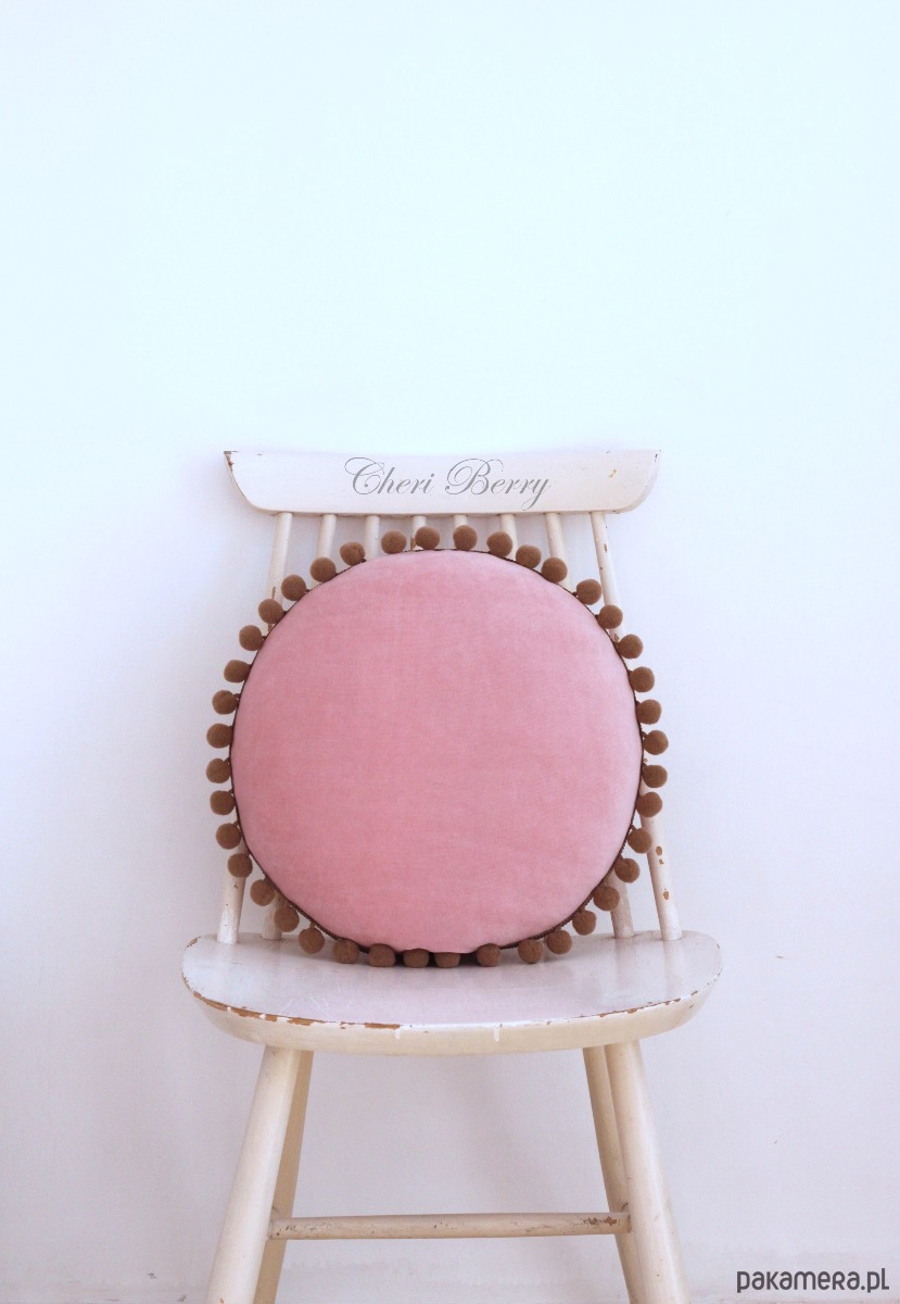 Poduszka welur okrągła z pomponami boho brudny różowy