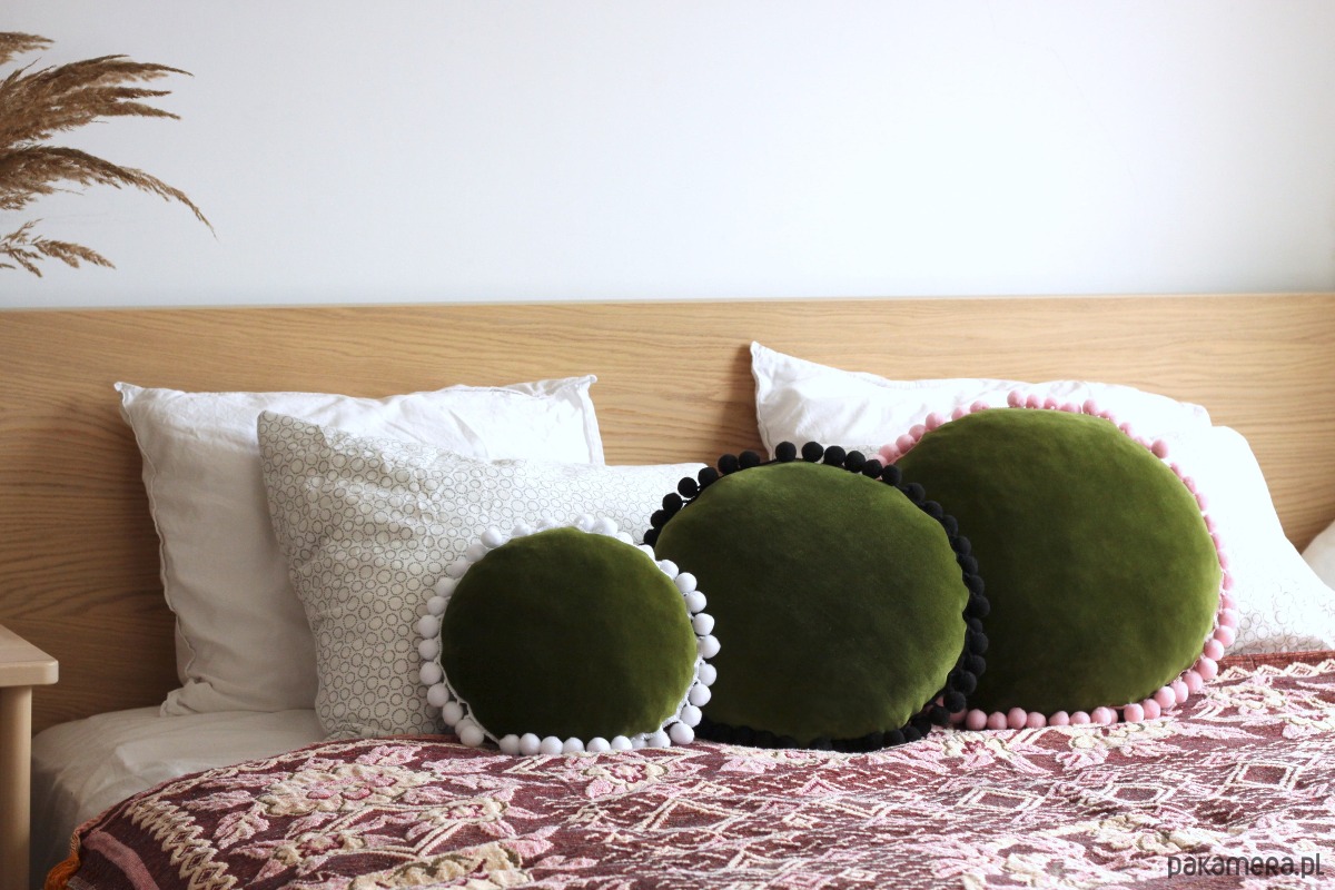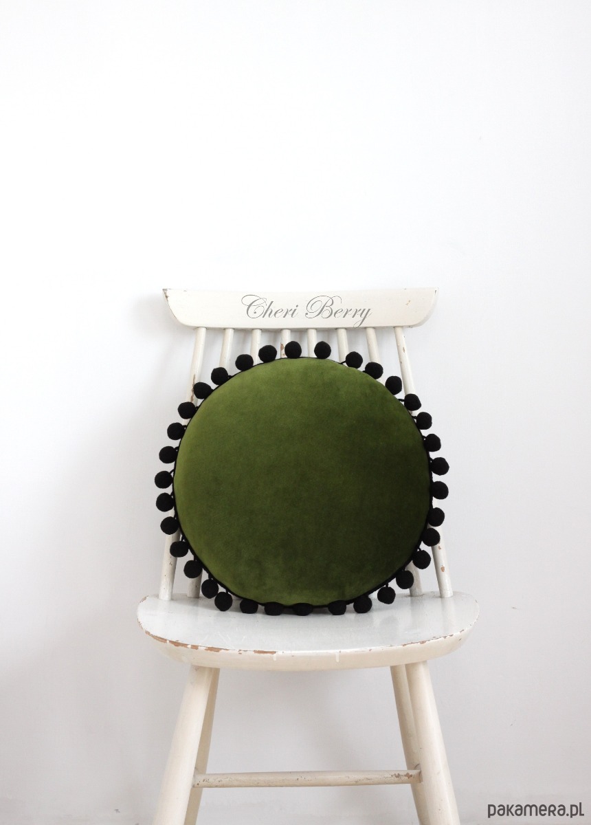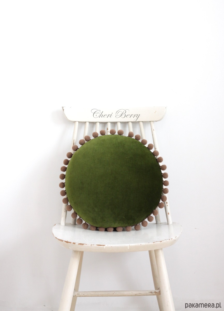Poduszka welur okrągła z pomponami boho brudny zielony