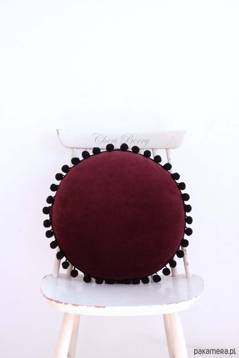 Poduszka welur okrągła z pomponami vintage bordowa
