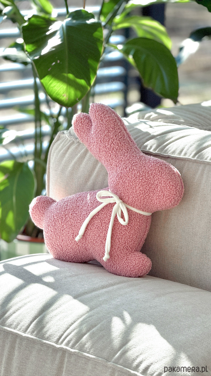 Różowa poduszka zajączek to wyjątkowa poduszka dekoracyjna do pokoju dziecka. Uroczy kształt zajączka sprawia, że poduszka pięknie prezentuje się na łóżku, fotelu lub w dziecięcym kąciku, dodając wnętrzu ciepła i delikatnego, dziecięcego charakteru. Wykonana z materiału bouclé (100% poliester), który nadaje jej bardzo przytulny wygląd. Dodatkowym urokiem jest kremowa, welurowa kokardka zawiązana na szyi zajączka.