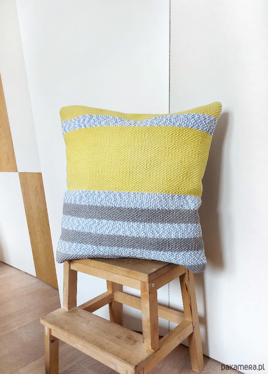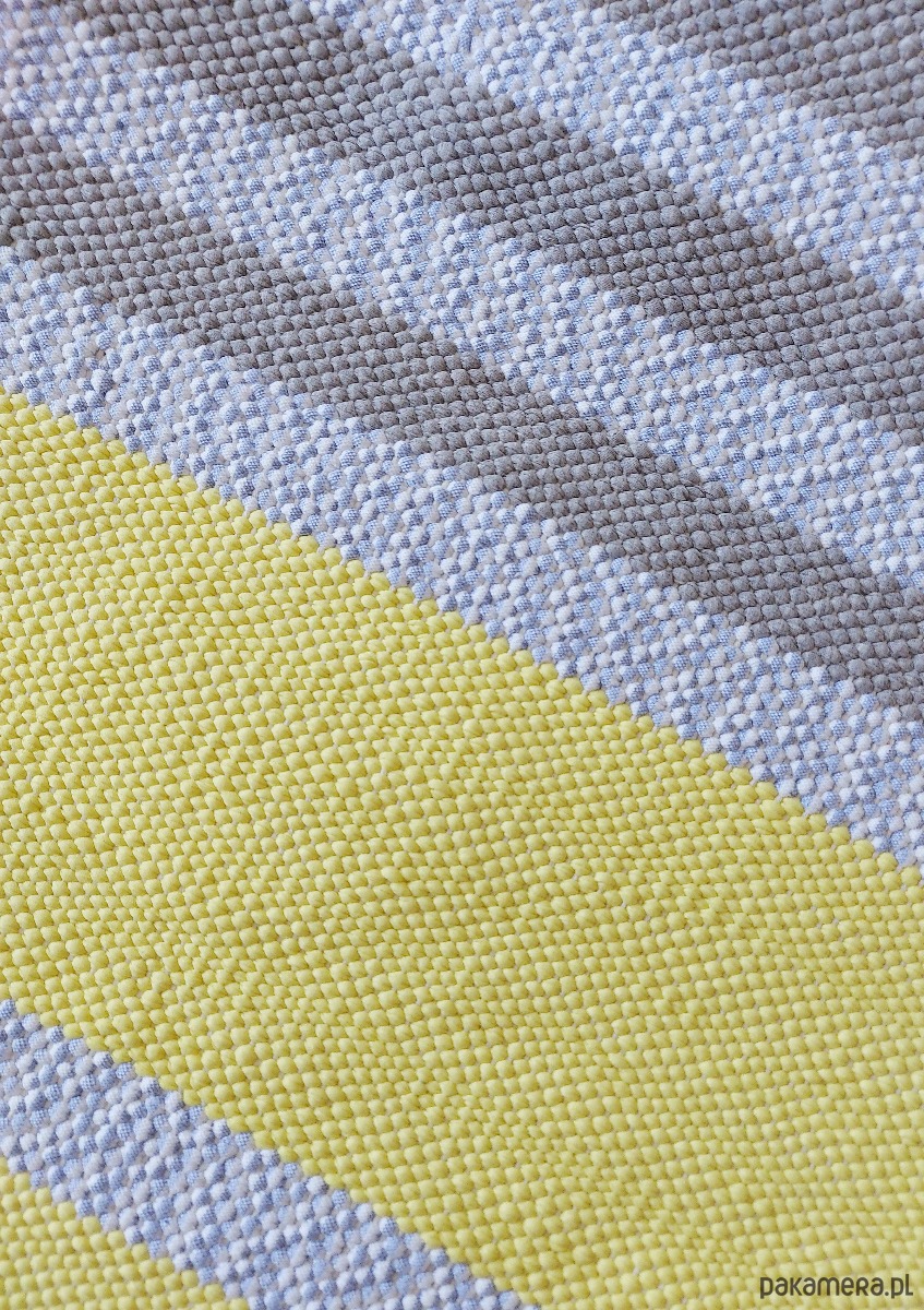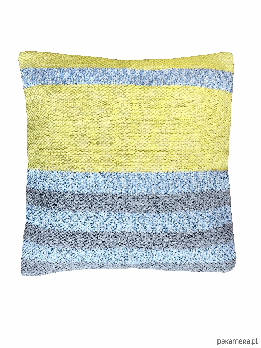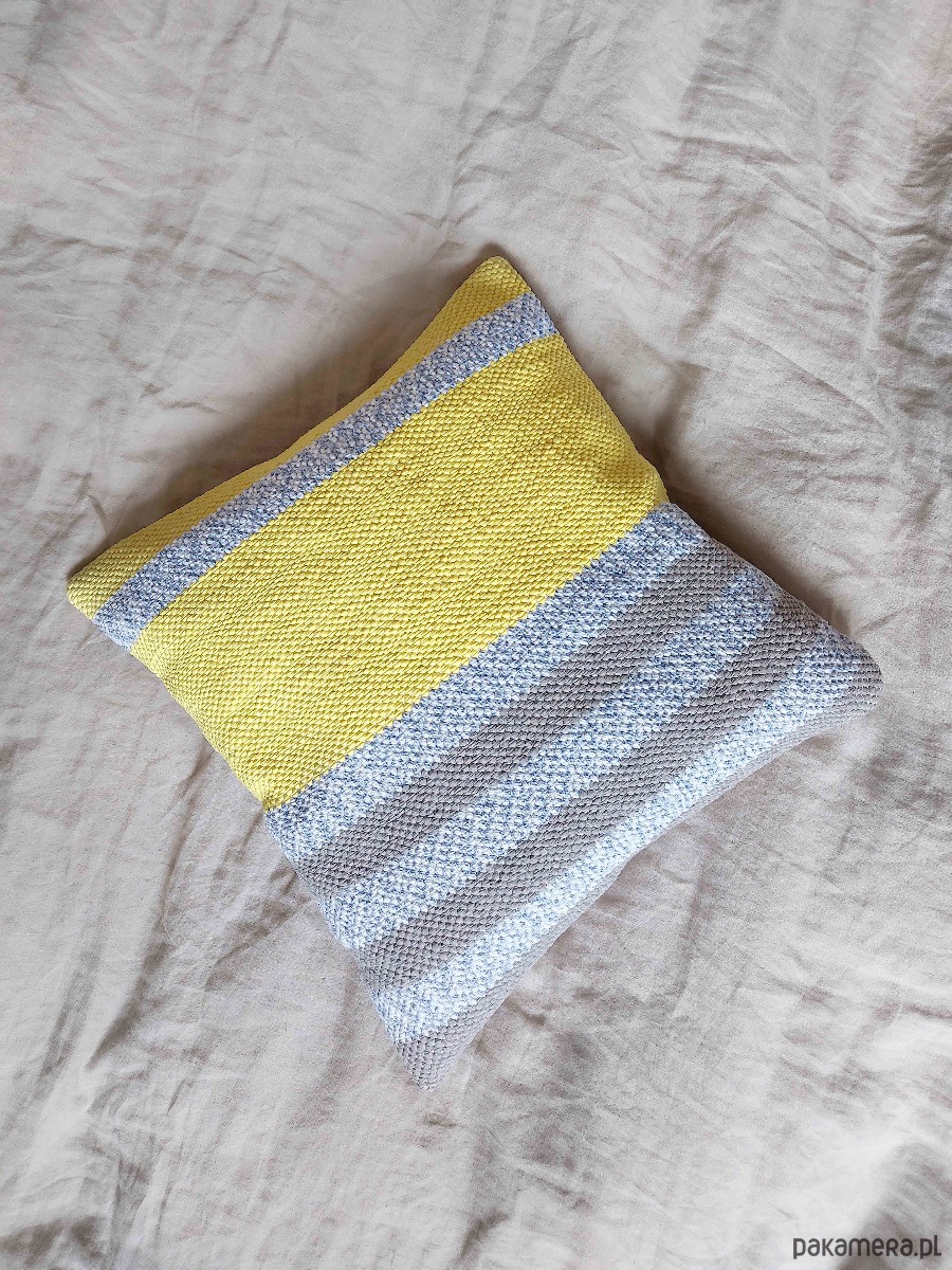 Wzór w paski. Przód poszewki ręcznie tkany. Wyprodukowano w małym warsztacie tkackim w Warszawie. Wykonane 100% ręcznie na ramie tkackiej w technice kilimowej. Do produkcji frontu poszewki użyto sznurków bawełnianych typu Cotton Spaghetti, które produkuje się w 100% z materiałów pochodzących z recyclingu. Organiczna przędza typu t-shirt wykonana została z ciętej dzianiny, głównie t-shirtów. Przędza włókiennicza Cotton Spaghetti to mieszanka bawełny i innych włókien.Poszewka zapinana na kryty suwak. Wypełnienie: poduszka poszewka 100% bawełna wypełniona kaczym pierzem.