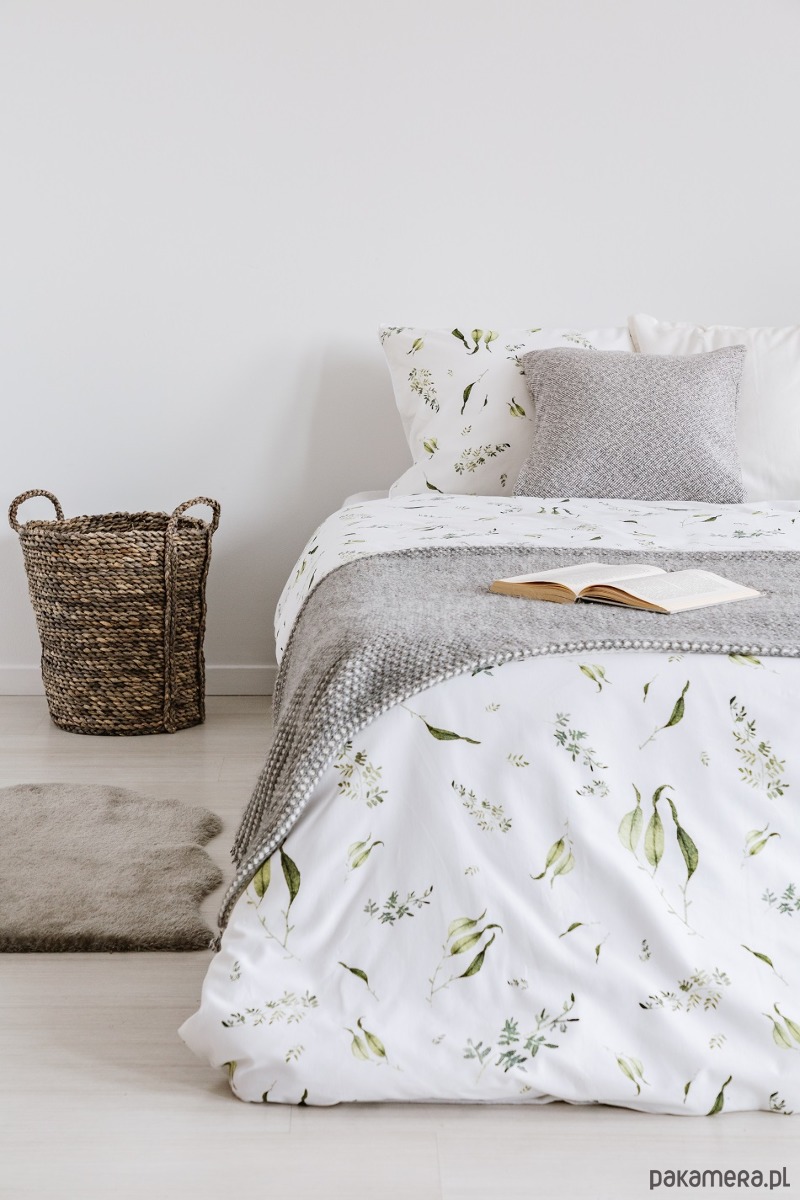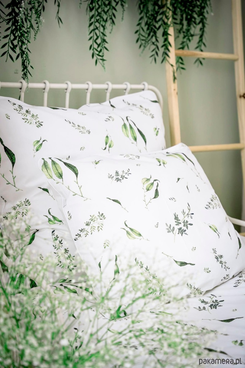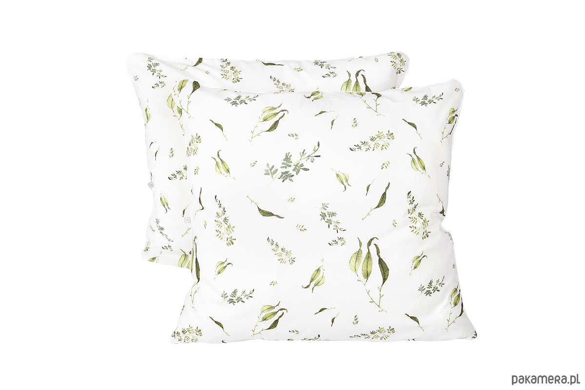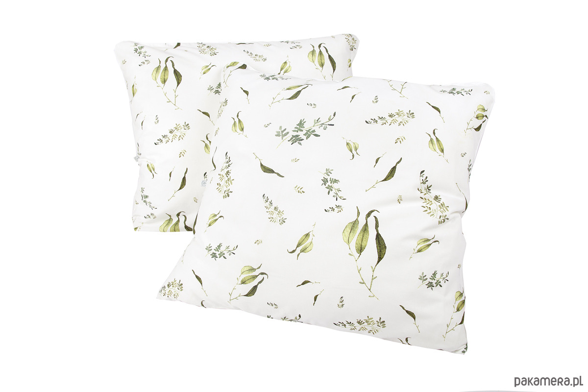 Poszewka z ręcznie malowanym wzorem w listki, jednostronnym, w całości obszyta bawełnianą lamówką. Wzór został objęty ochroną praw utorskich i został stworzony przez zdolną ilustratorkę Merely Susan. Ze względu na użycie materiału we wzór, poszczególne sztuki mogą różnić się miejscem jego rozmieszczenia.