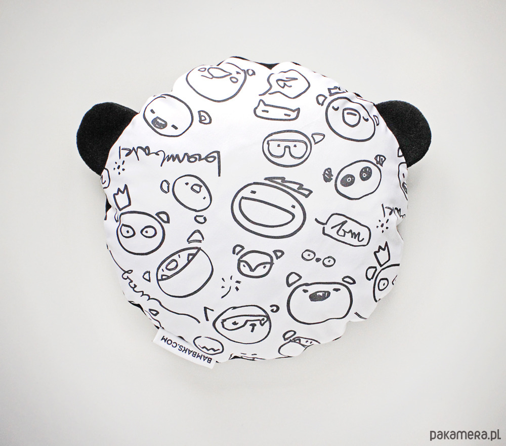 Poducha Bambakowa ma przód z bawełnianej tkaniny z nadrukiem naszego autorskiego rysunku Bambakowych pysiów.
