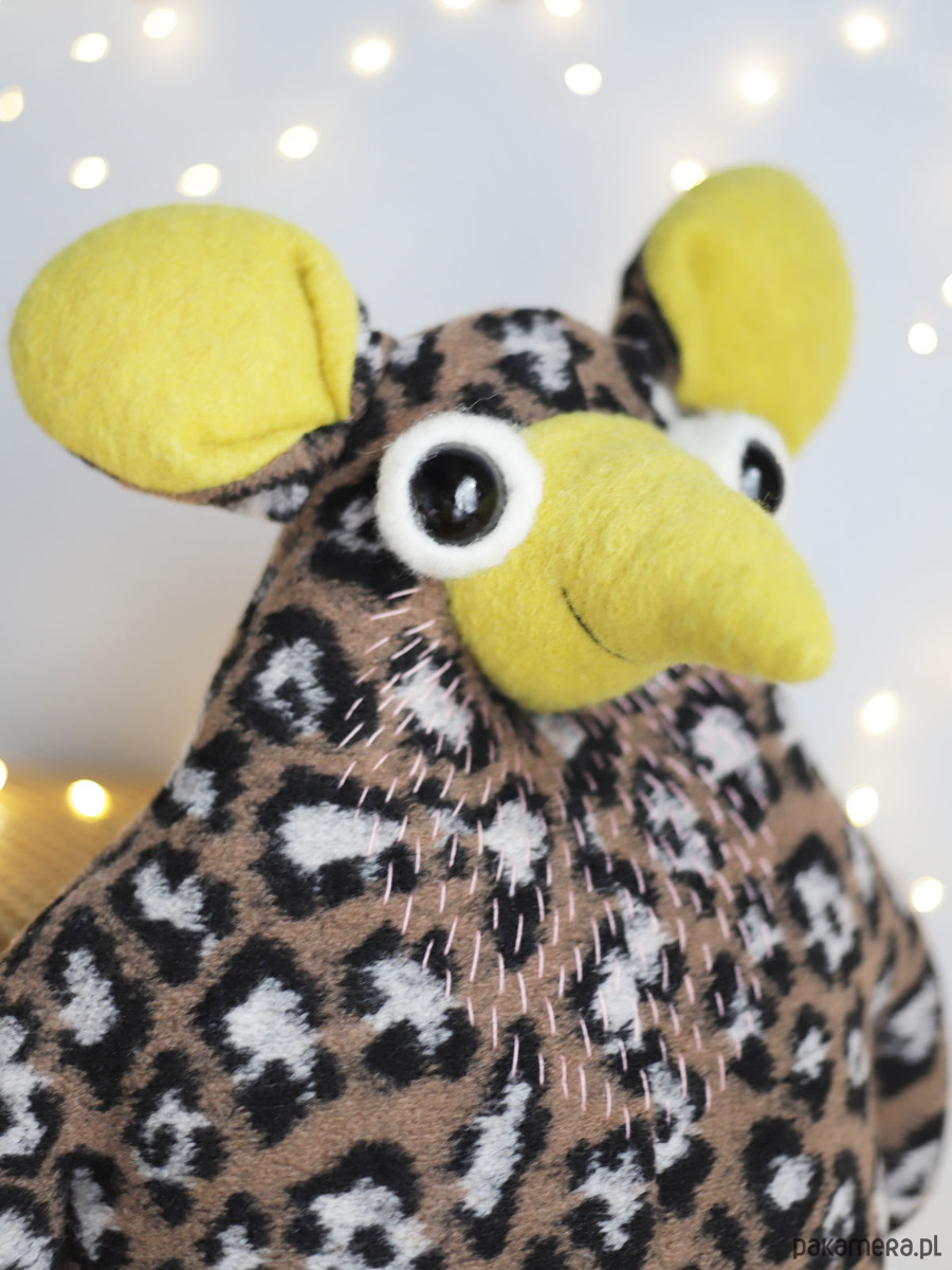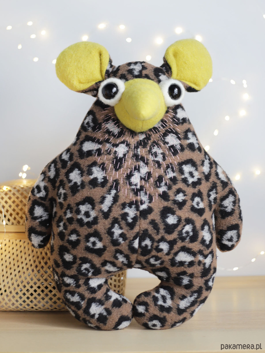 Materiały: uszyty z wełnianej dzianiny, oczy stworzone z malowanego drewna, wypełniony antyalergicznym puchem poliestrowym.