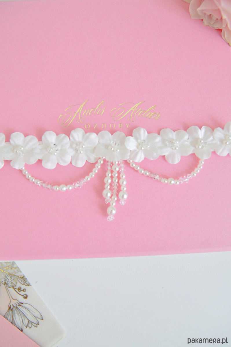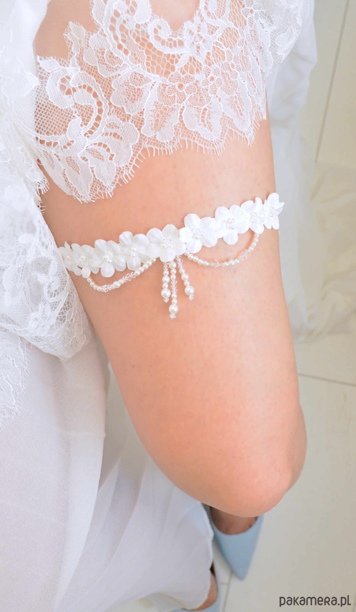 Podwiązka uszyta z gumki, kwiatków oraz pereł z kryształkami. W każdym kwiatku wszyte perełki Preciosa oraz kryształek Swarovskiego. Dodatkową dekorację stanowi sznur pereł. Kolor ivory, dostępna także wersja biała. Na życzenia doszywamy z tyłu podwiązki niebieską kokardkę lub inny niebieski element. Szerokość podwiązki 2 cm. Podwiązka bardzo wygodna, miękka i elastyczna. Podwiązki szyjemy w naszym atelier z najwyższej jakości materiałów.