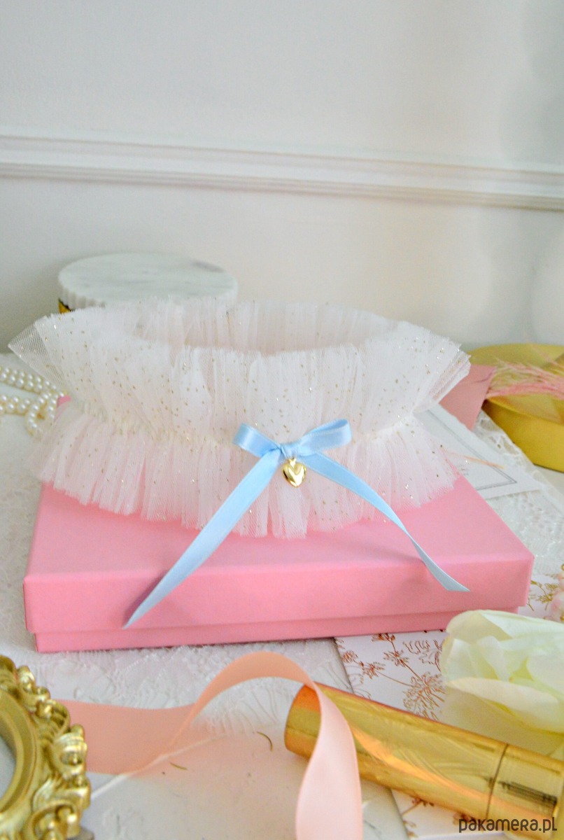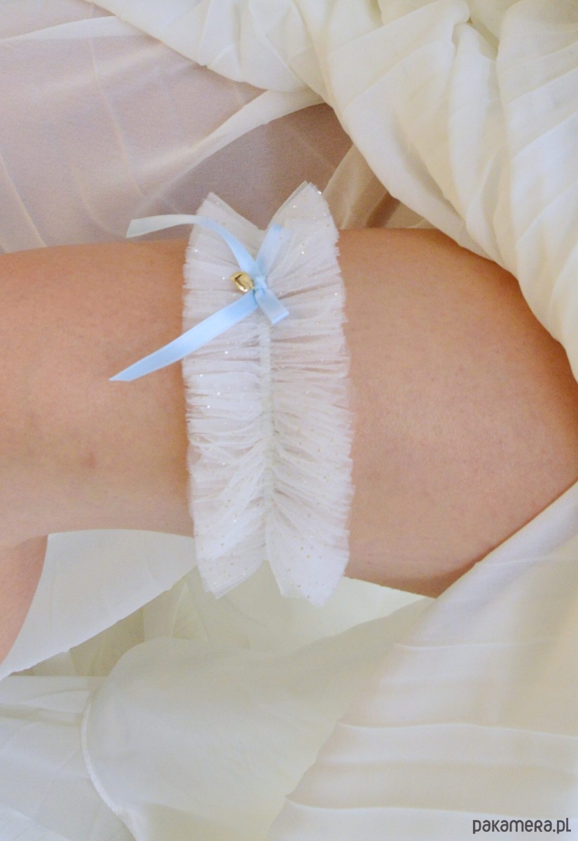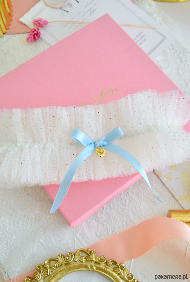 Romantyczna podwiązka wykonana z trzech warstw włoskiego tiulu w kolorze ivory i cielistym oraz koronki francuskiej. Dodatkową dekorację stanowi aplikacja koronkowa bogato wyszywana cekinami, kokardka dwustronna w kolorze niebieskim jasnym. Podwiązka elastyczna, lekka i wygoda, idealna do szerszych spódnic. Wykonana z najwyższej jakości materiałów.