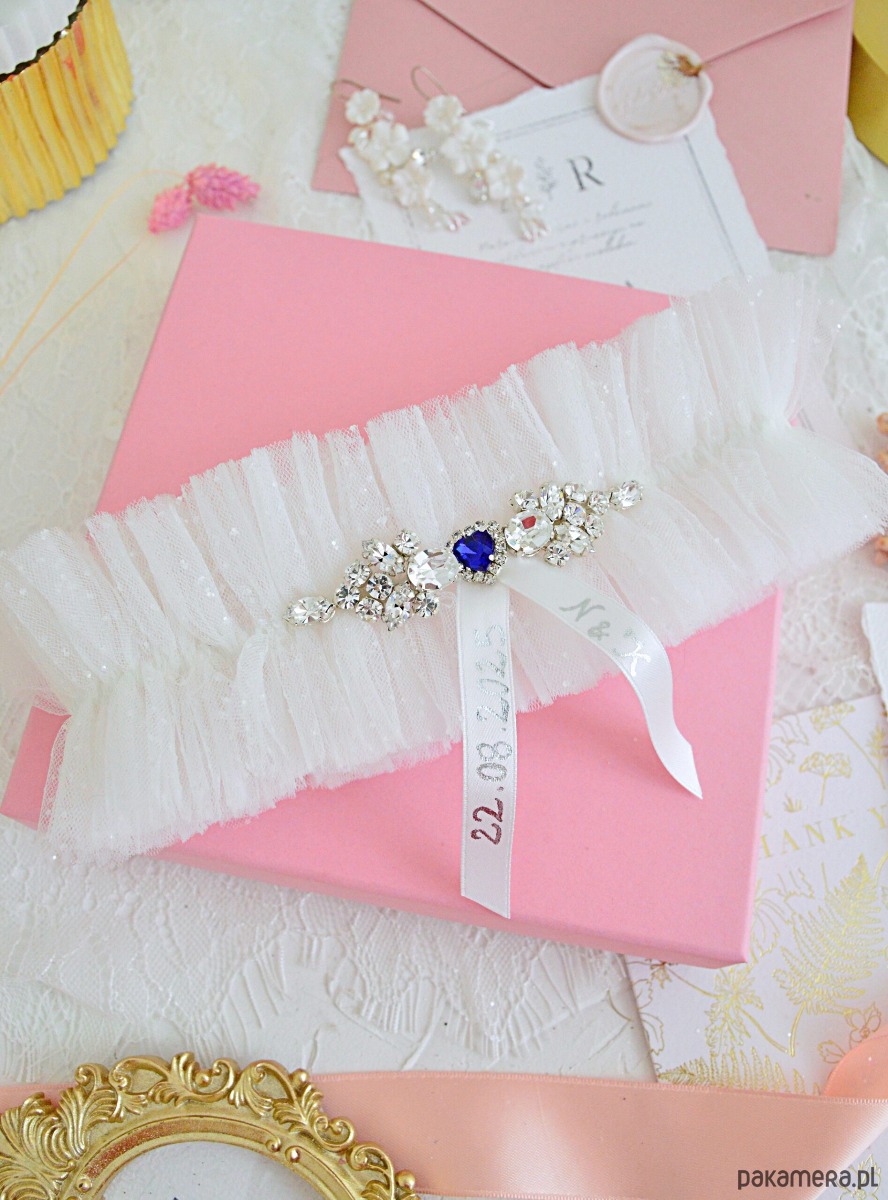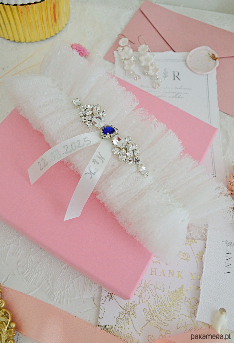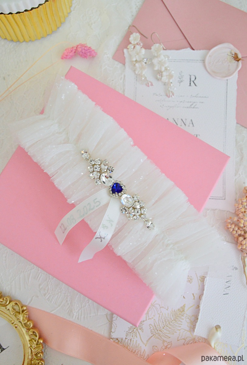 Podwiązka w stylu glamour wykonana z trzech warstw włoskiego tiulu w kolorze ivory, górna warstwa bogato zdobiona pięknie mieniącym się brokatem. Dodatkową dekorację stanowią cyrkonie Preciosa w srebrnej oprawie wyszyte ręcznie. W środku niebieskie serduszko. Podwiązka elastyczna, lekka i wygoda, idealna do szerszych spódnic.