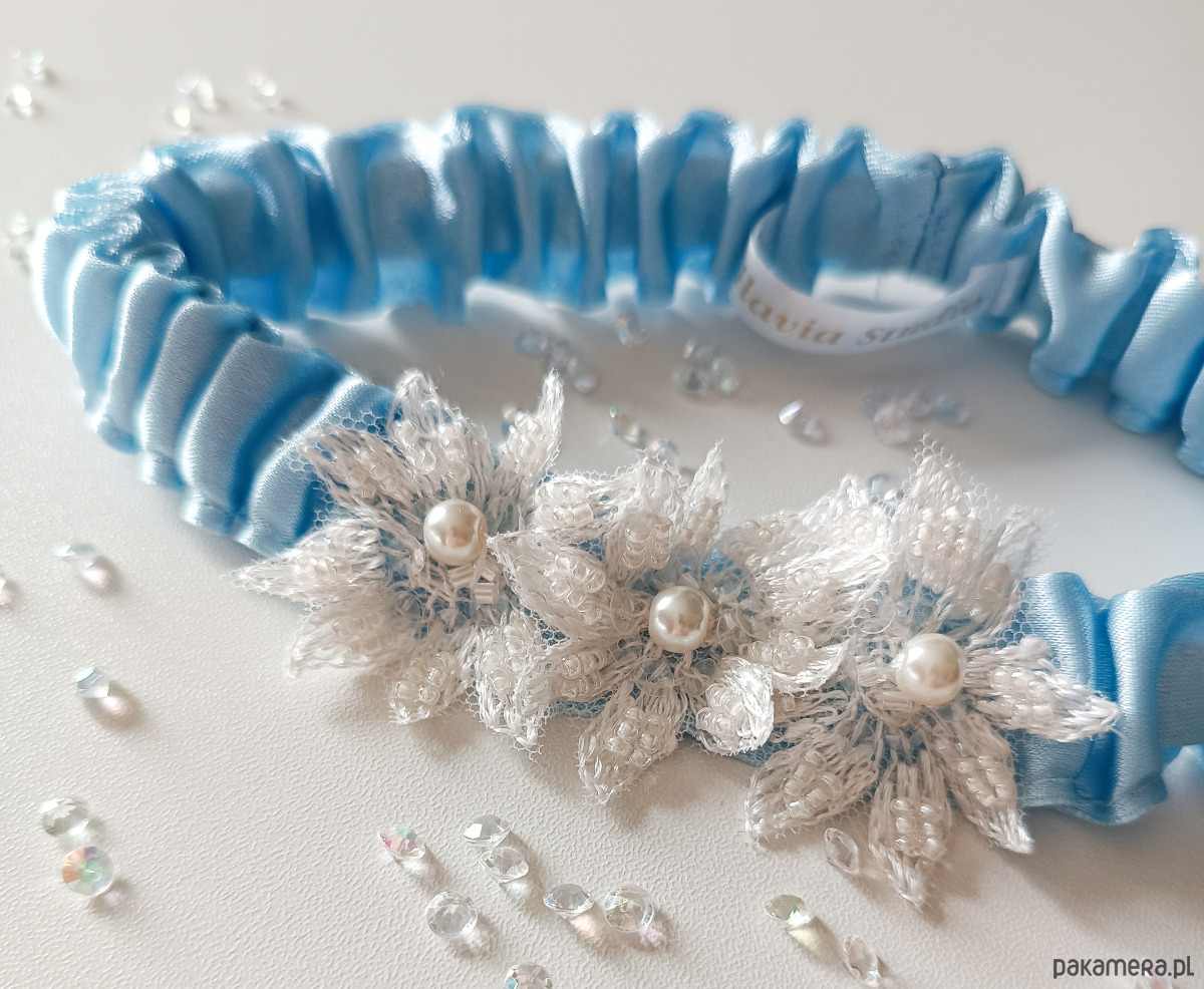 Przedstawiam Ci wyjątkową podwiązkę ślubną Kate, która przykuwa uwagę swoim niezwykłym urokiem i starannym wykonaniem. Uszyta z delikatnej niebieskiej satyny i udekorowana trzema bogato zdobionymi kwiatami z koronki w kolorze ivory, ta podwiązka emanuje elegancją i subtelnością.