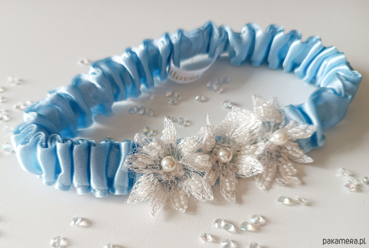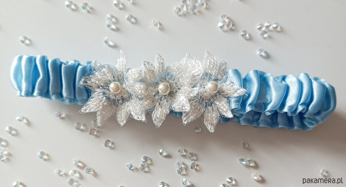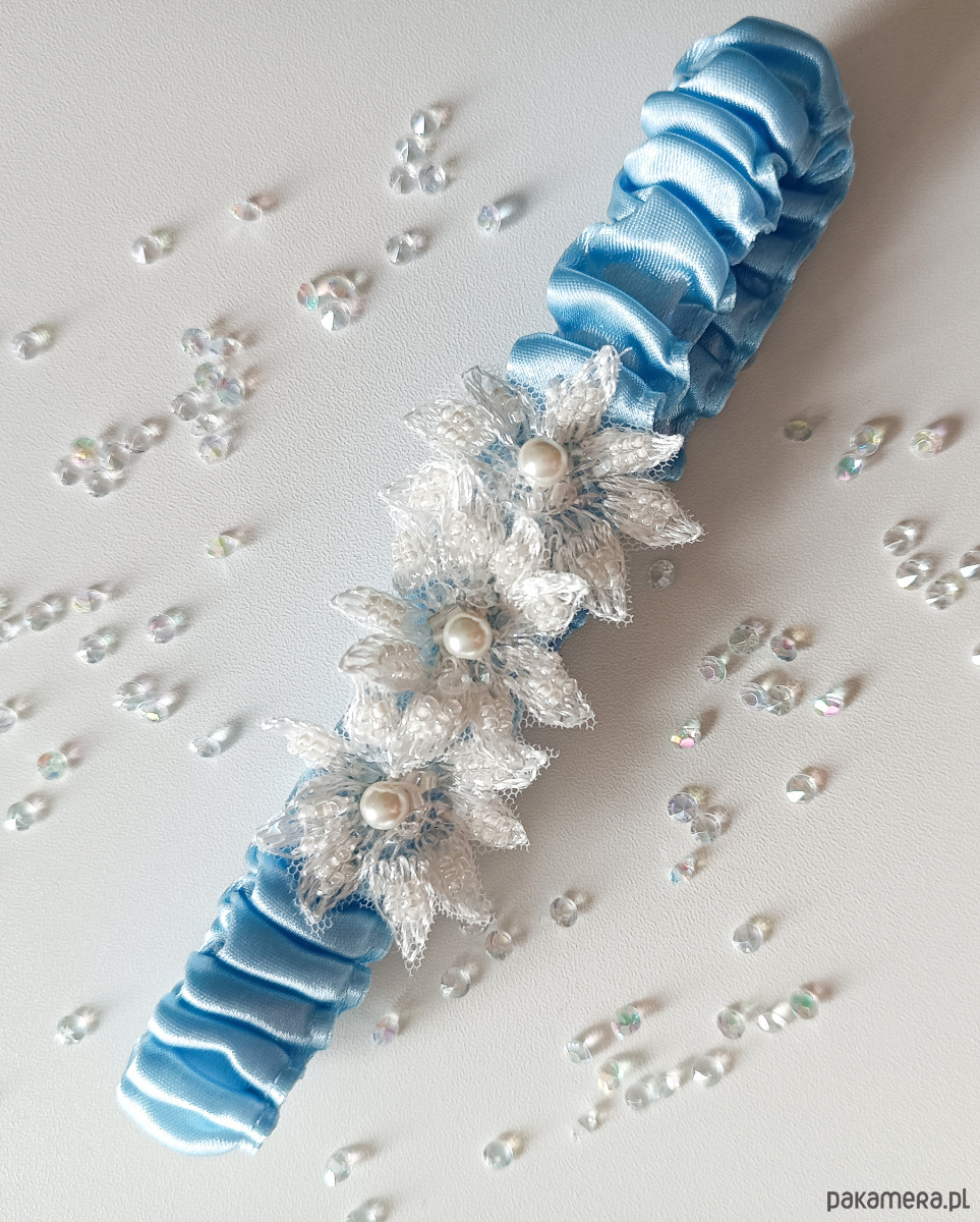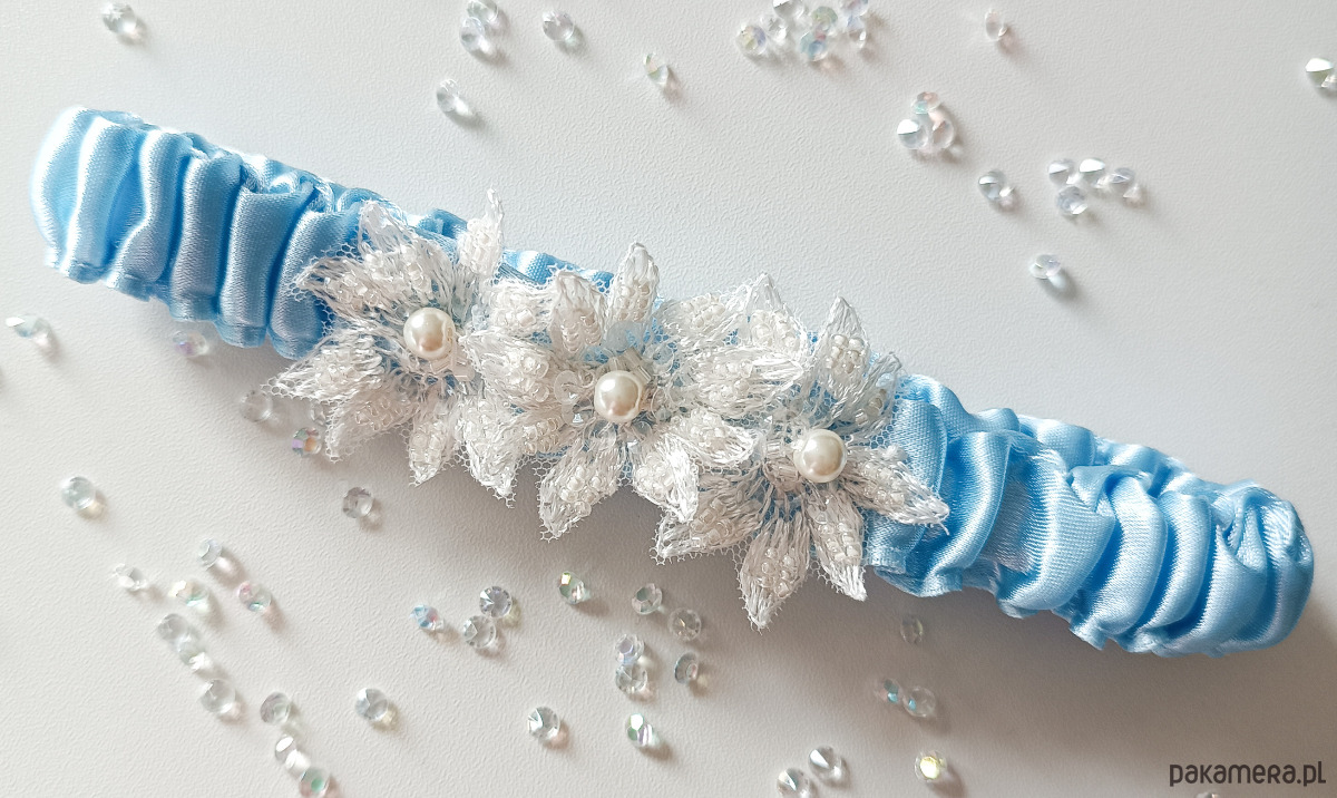 Szerokość podwiązki 2 cm. Średnica 1 kwiatka – około 3 cm.