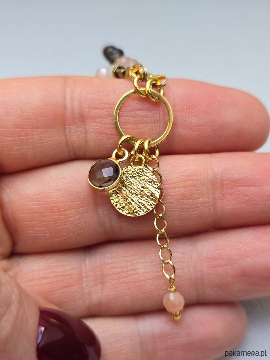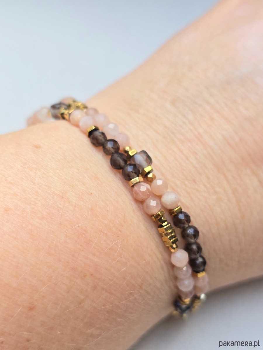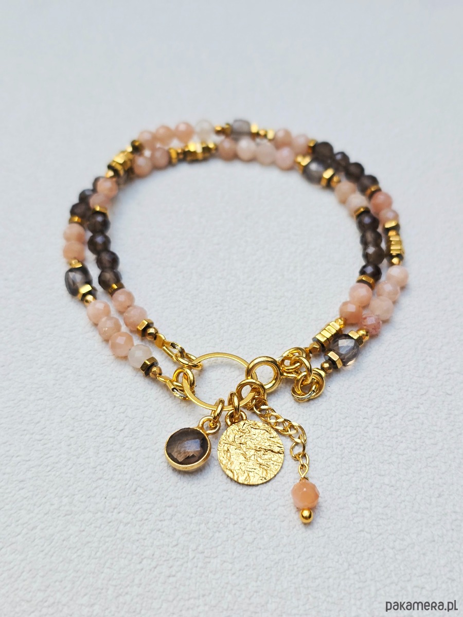 Delikatna, podwójna bransoletka wykonana z kamieni słonecznych, dymnych kwarców, którym towarzyszą przekładki ze złoconego hematytu.