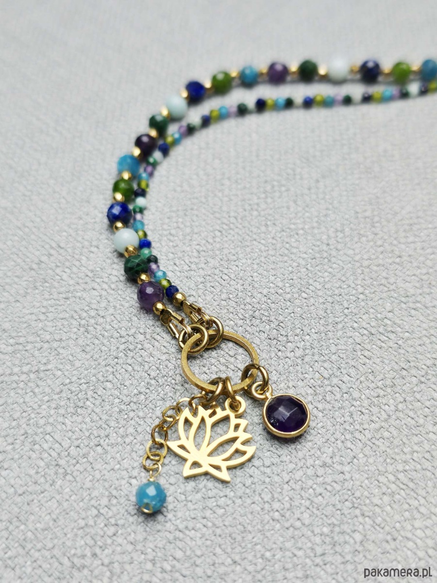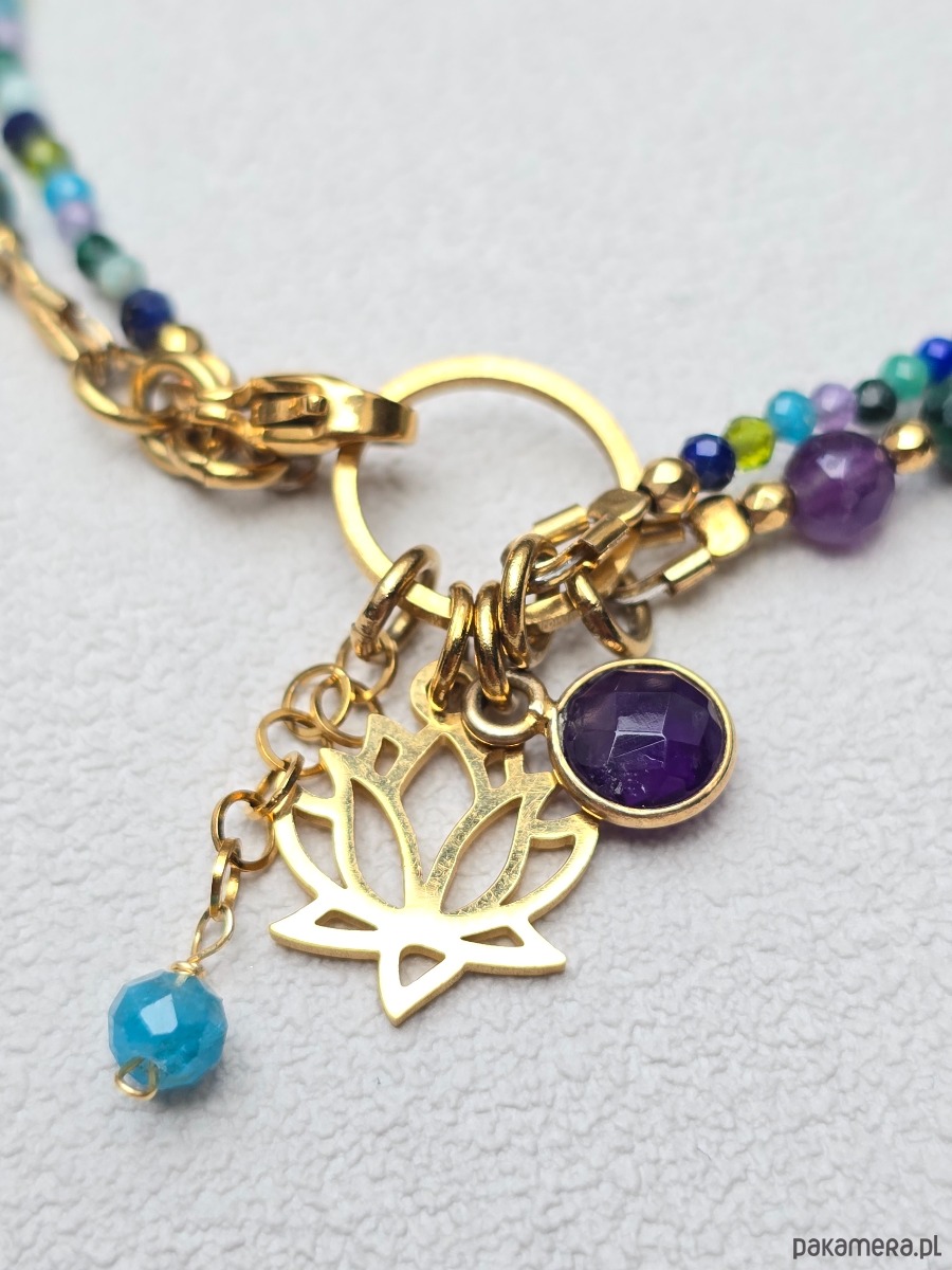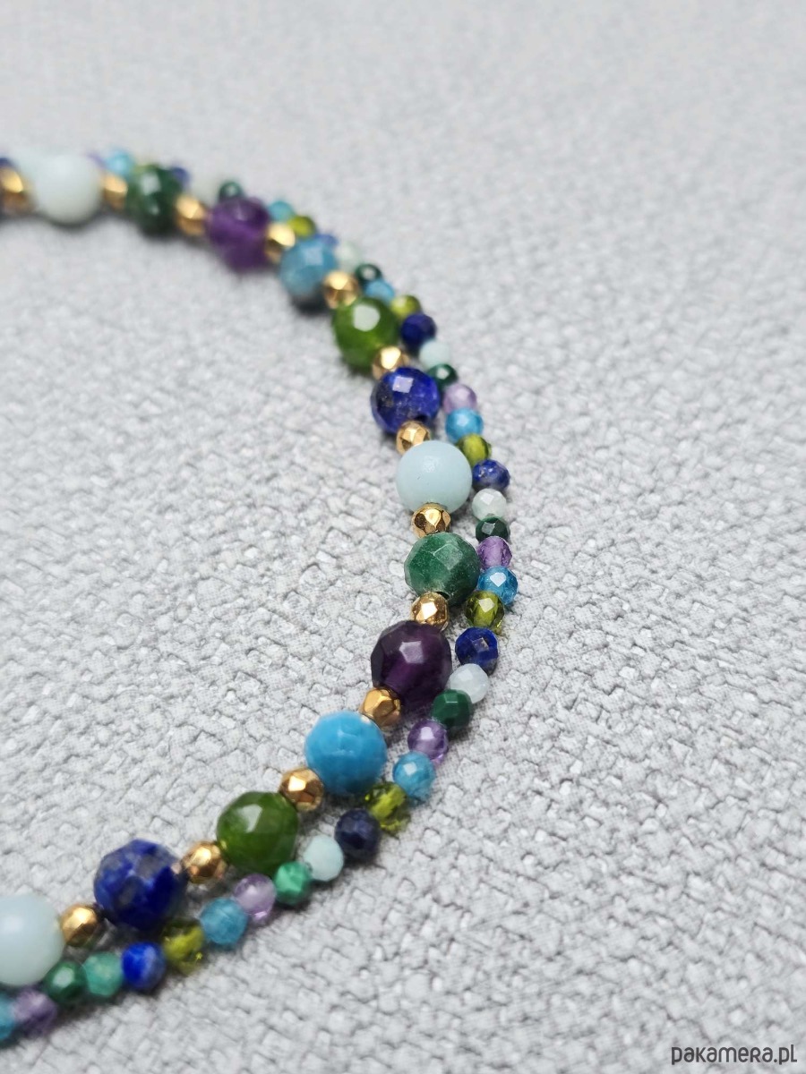 Nasycona kolorami, podwójna bransoletka. Wykonana z 4mm i 2mm kulek kamieni: ametystu, malachitu, lapisu lazuli, apatytu, amazonitu i zielonego jadeitu.