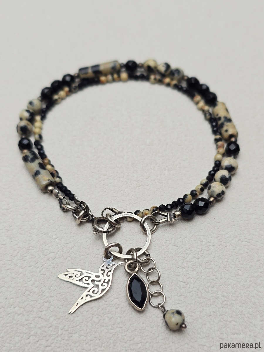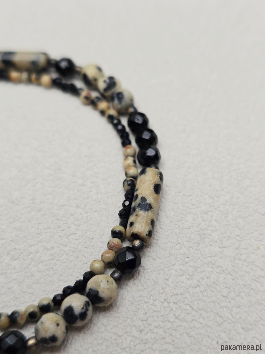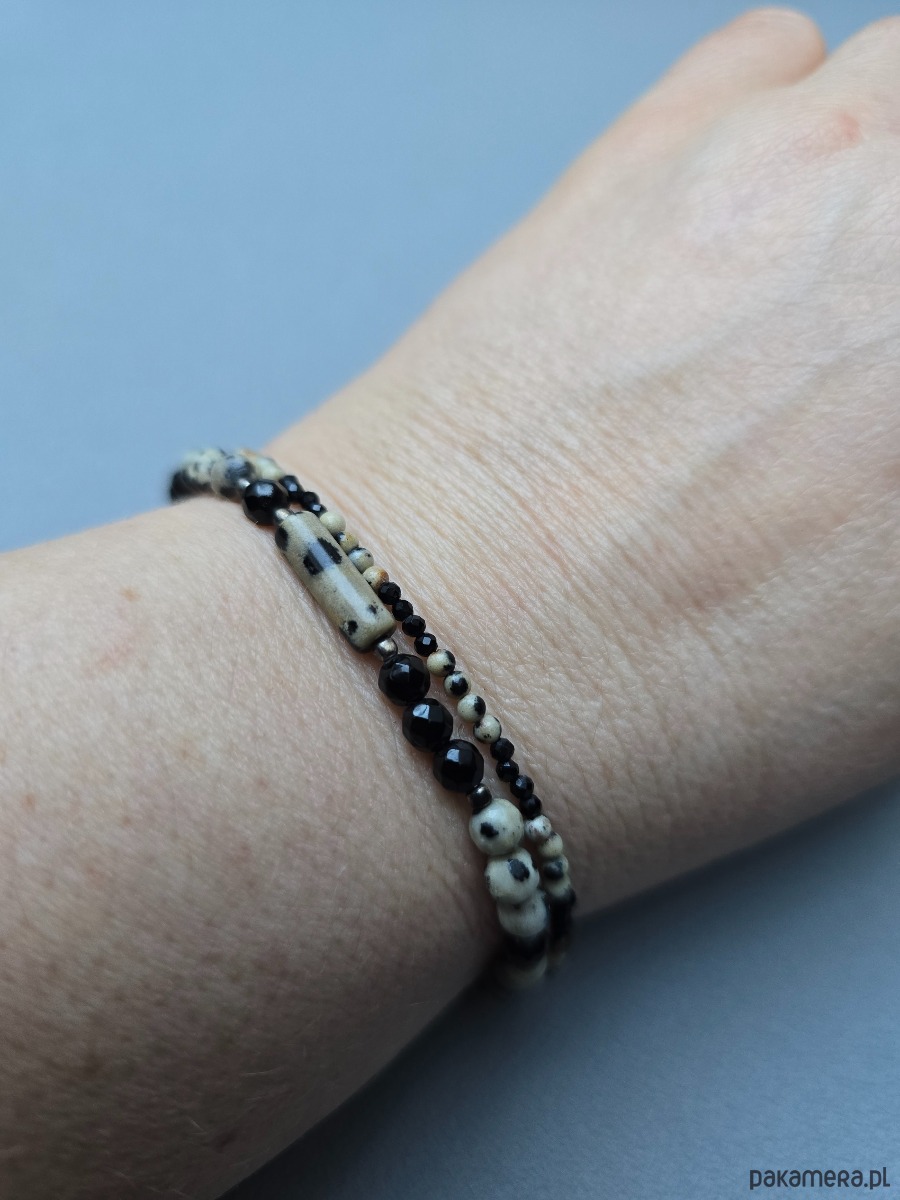 Wyjątkowa, podwójna bransoletka z zawieszkami. Wykonana z 2 i 4mm kamyków jaspisu dalmatyńskiego i czarnego onyksu. Wykończona w oksydowanym i przetartym srebrze próby 925.