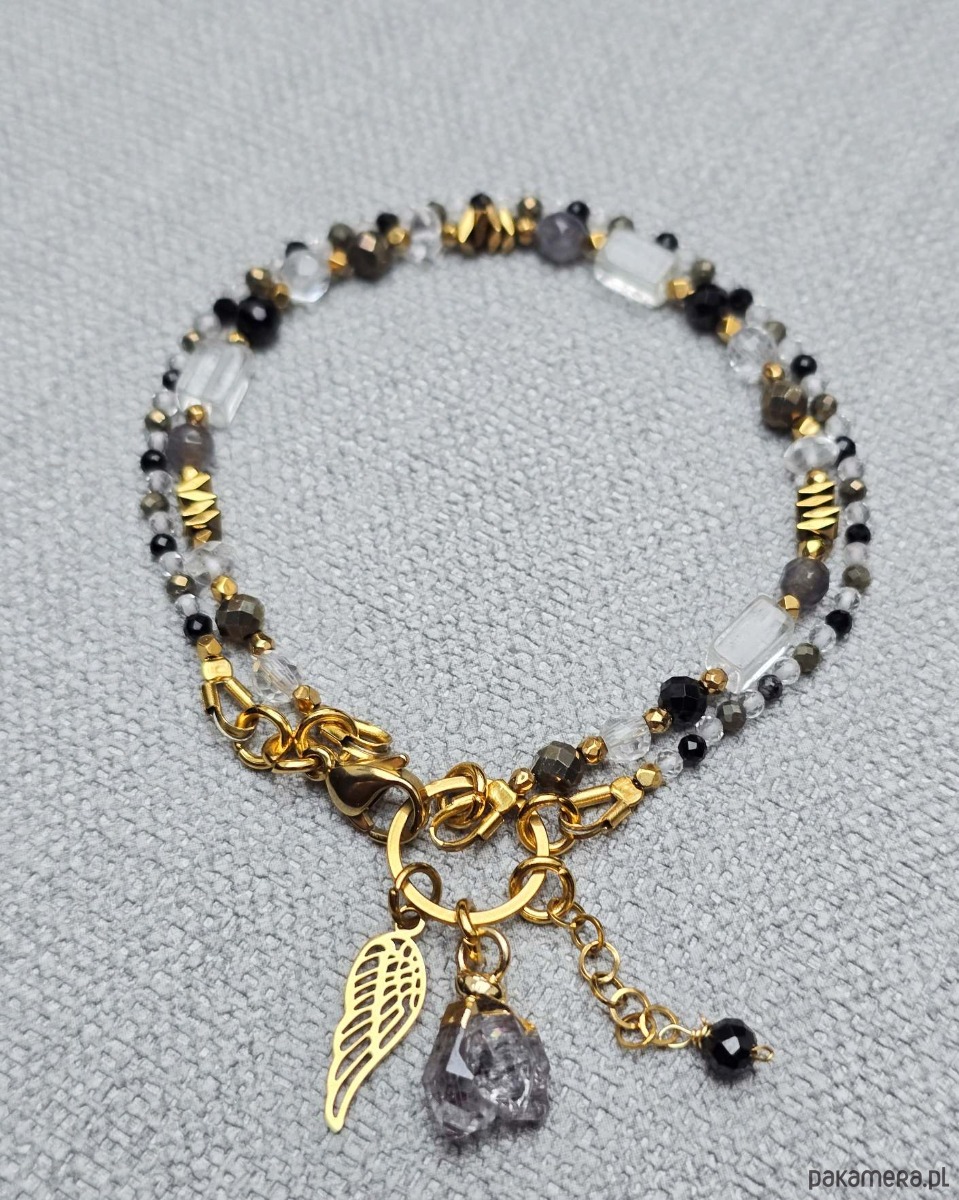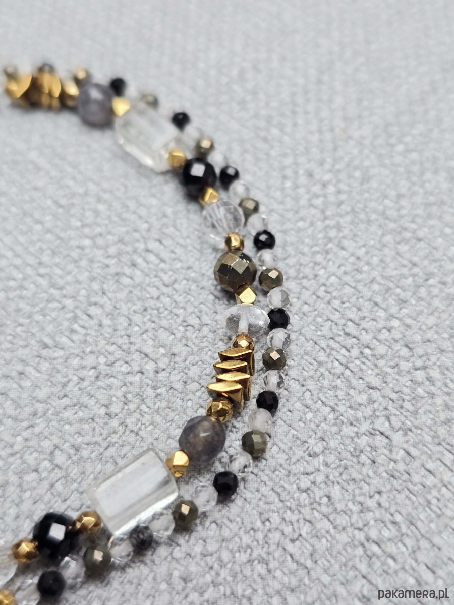 Wykorzystane kamienie to: kryształ górski, piryt, czarny spinel, szary agat i złocony hematyt.